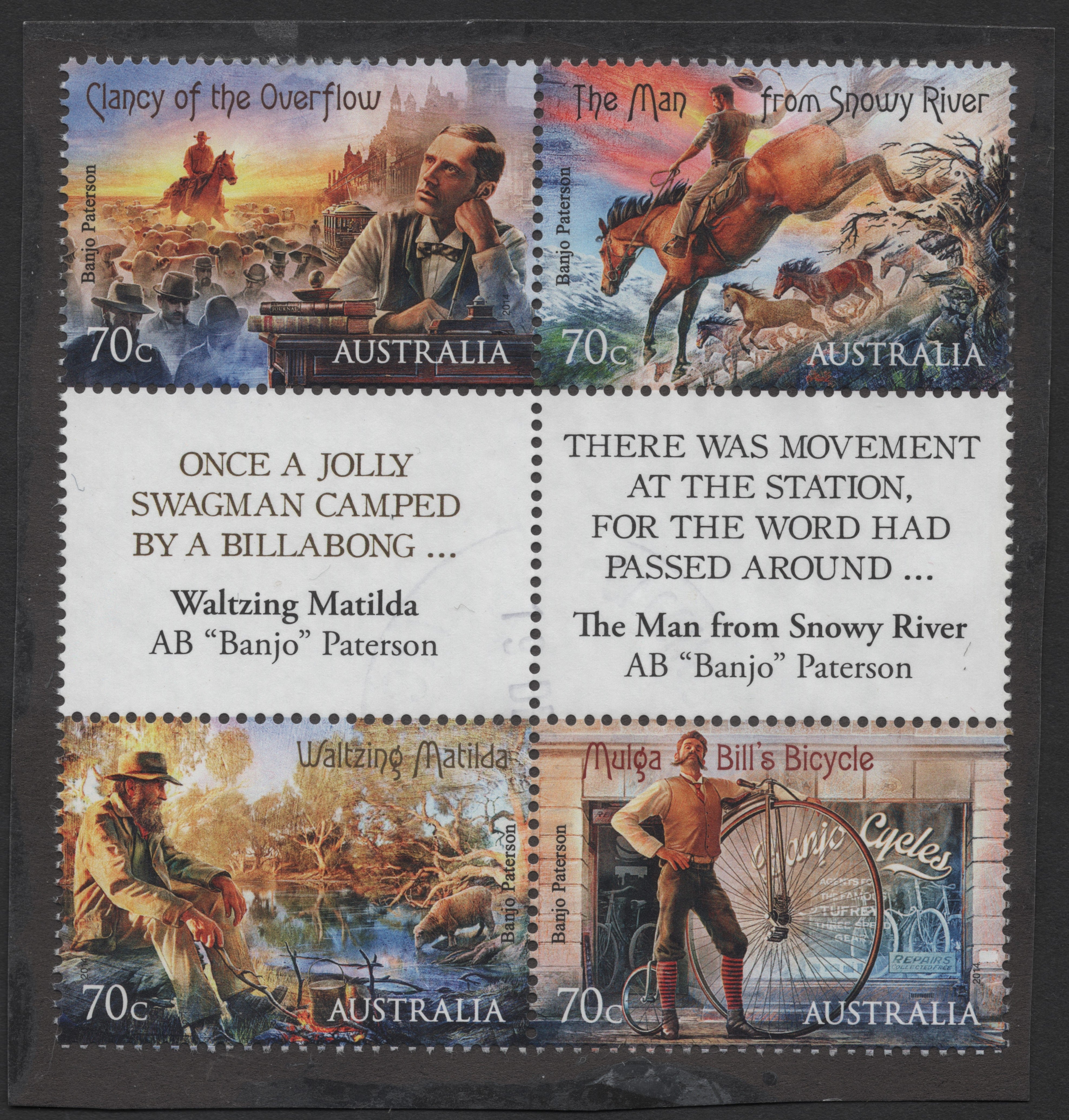 Rs. 80.00Rs. 80.00/This used stamp block from Australia, issued in 2014, celebrates the literary legacy of A.B. "Banjo" Paterson. It includes four 70c stamps featuring iconic scenes from...