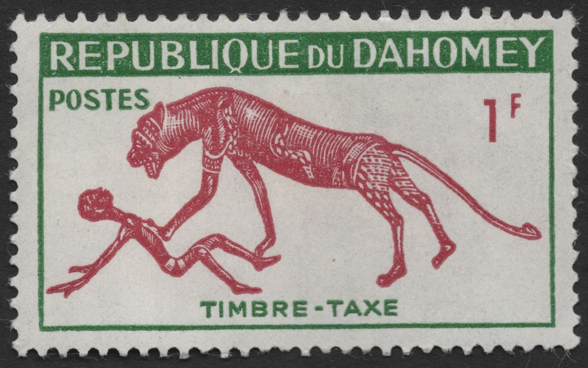Rs. 20.00Rs. 20.00/This 1 franc postage due stamp (timbre-taxe) from the Republic of Dahomey, now Benin, features a stylized red illustration based on traditional African art. The design...