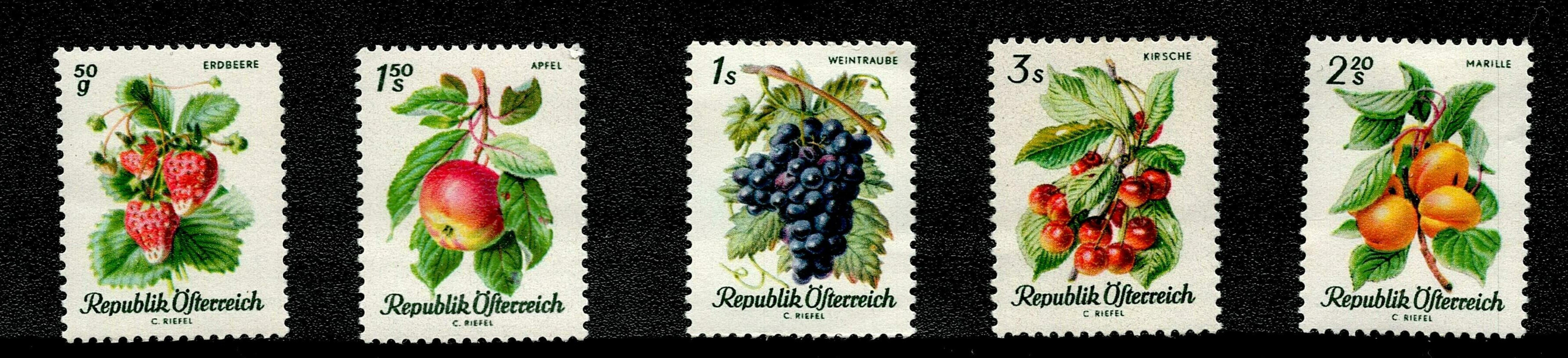 This is a delightful Austrian stamp set showcasing five different fruits in vivid botanical illustrations by C. Riefel. Issued by the Republik Österreich, the stamps feature...