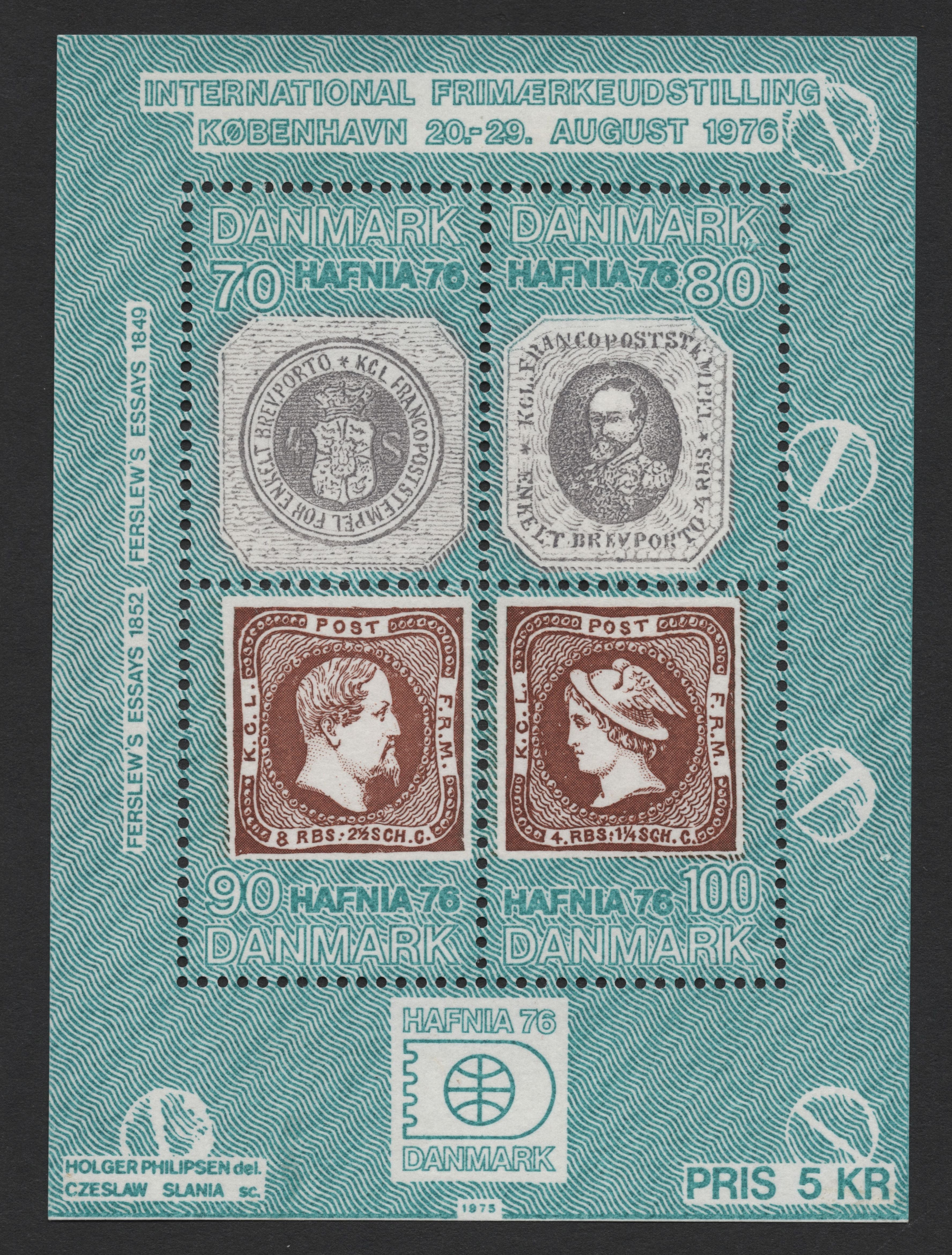 Rs. 60.00Rs. 60.00/This beautifully designed souvenir sheet was issued by Denmark in 1975 to promote the Hafnia 76 International Stamp Exhibition held in Copenhagen. It features four engraved...