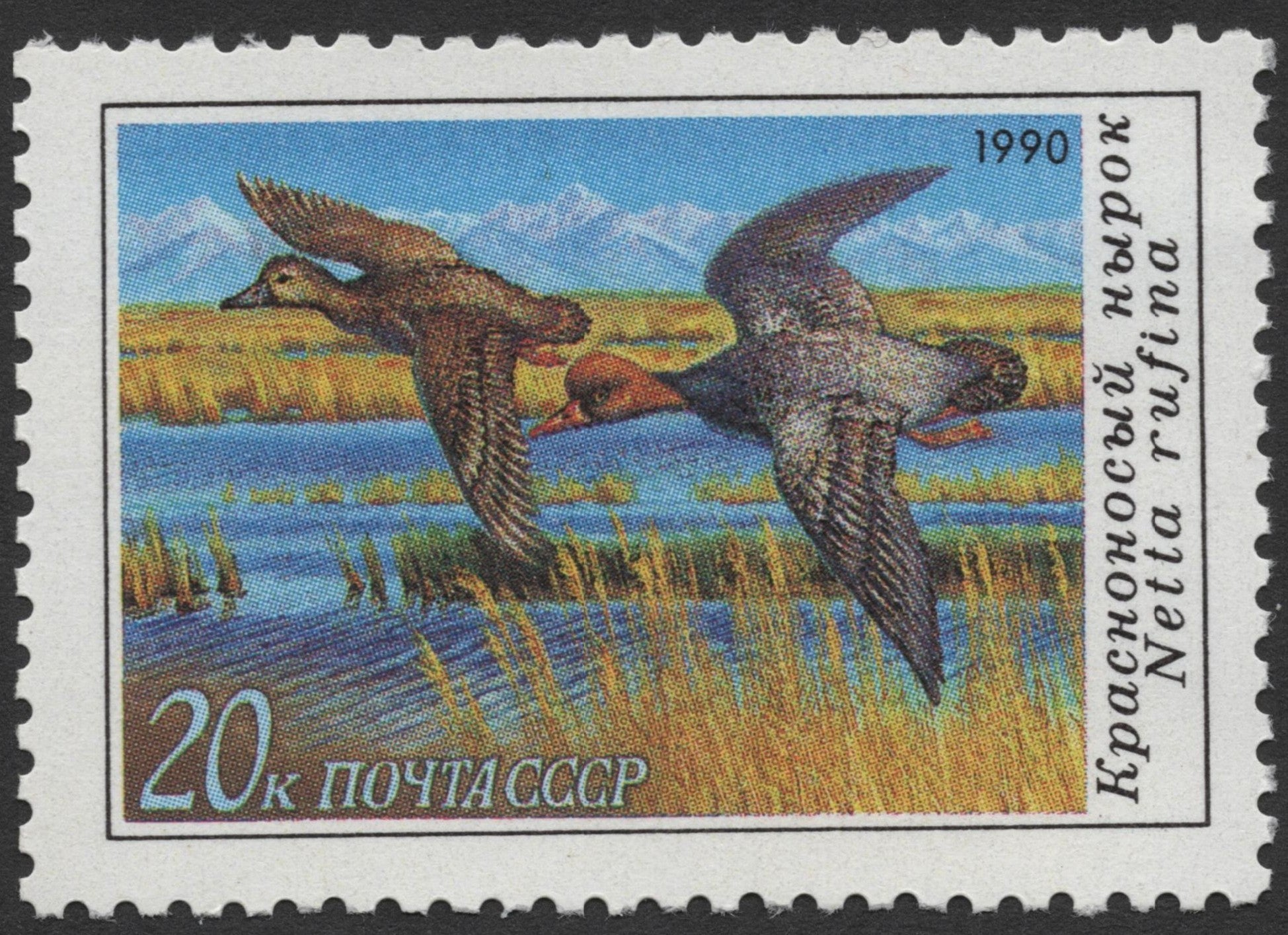Rs. 30.00Rs. 30.00/Issued by the Soviet Union in 1990, this vibrant stamp features a pair of Red-crested Pochards (Netta rufina) soaring over a marshland. The vivid naturalistic illustration...