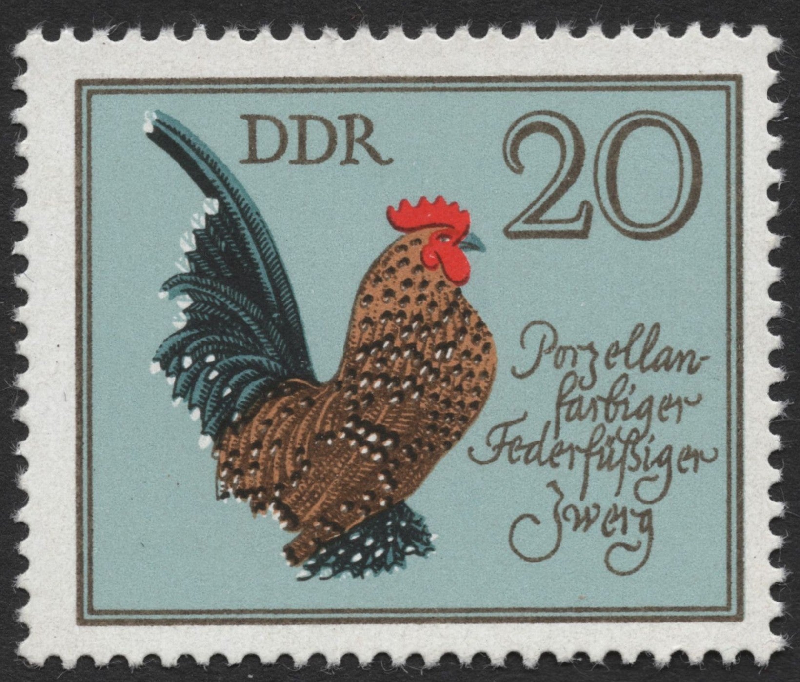 Rs. 30.00Rs. 30.00/This DDR 20 pfennig stamp features the “Porzellanfarbiger Federfüßiger Zwerg,” or porcelain-colored booted bantam, a decorative breed of dwarf chicken known for its striking plumage and...