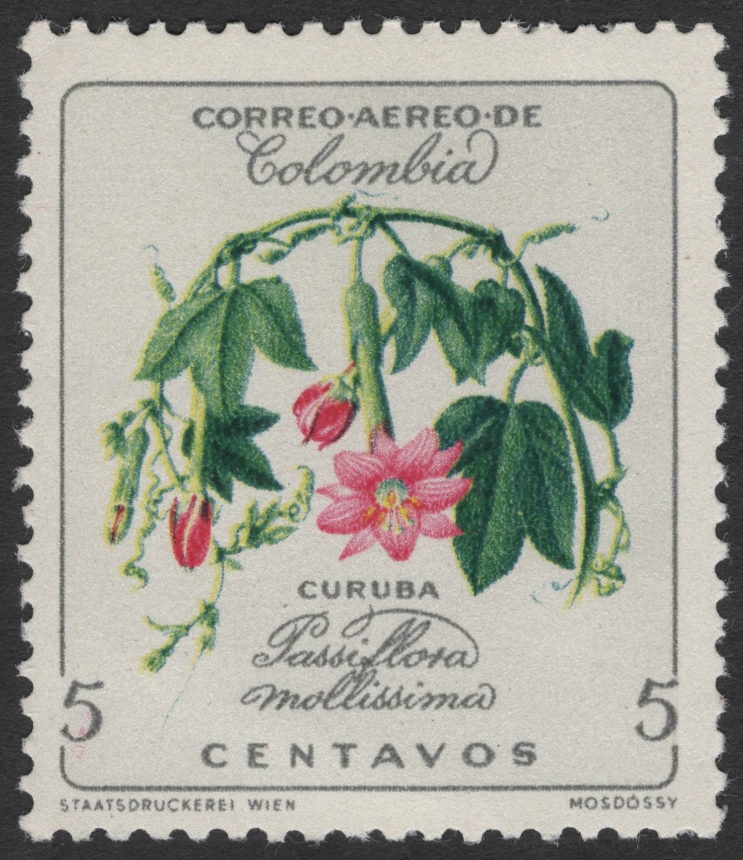 Rs. 20.00Rs. 20.00/This 5 centavos airmail stamp from Cuba showcases the Passiflora rubra, also known as red passionflower, rendered in delicate botanical detail. Issued as part of a...
