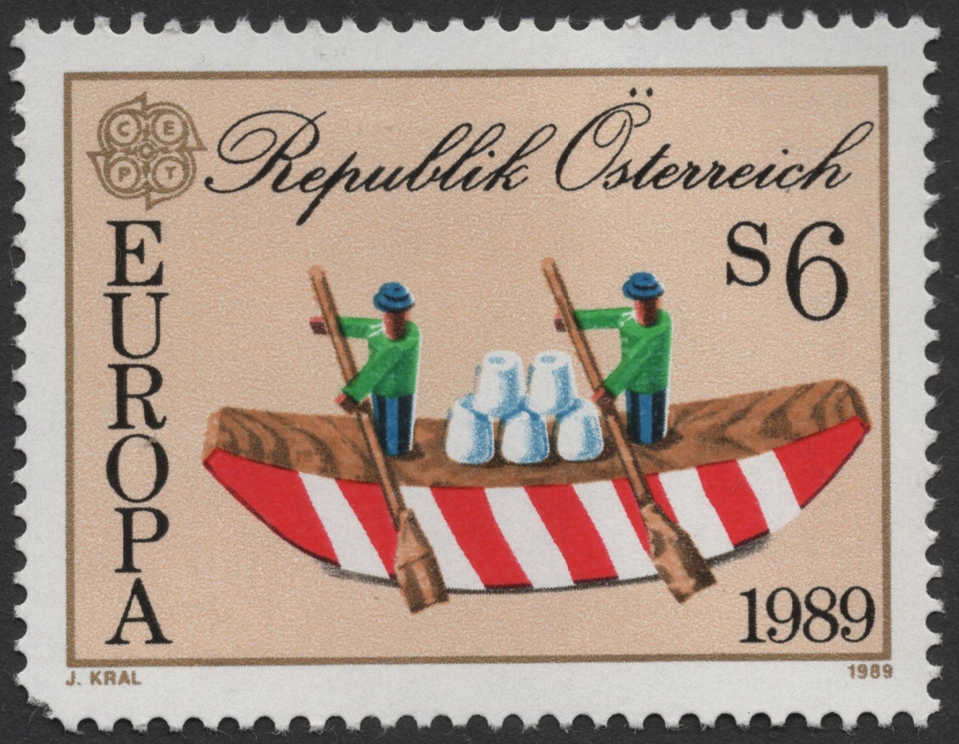 Rs. 20.00Rs. 20.00/Issued by Austria in 1989 for the Europa CEPT series, this 6 schilling stamp depicts a stylized wooden raft carrying stacked porcelain and guided by two...