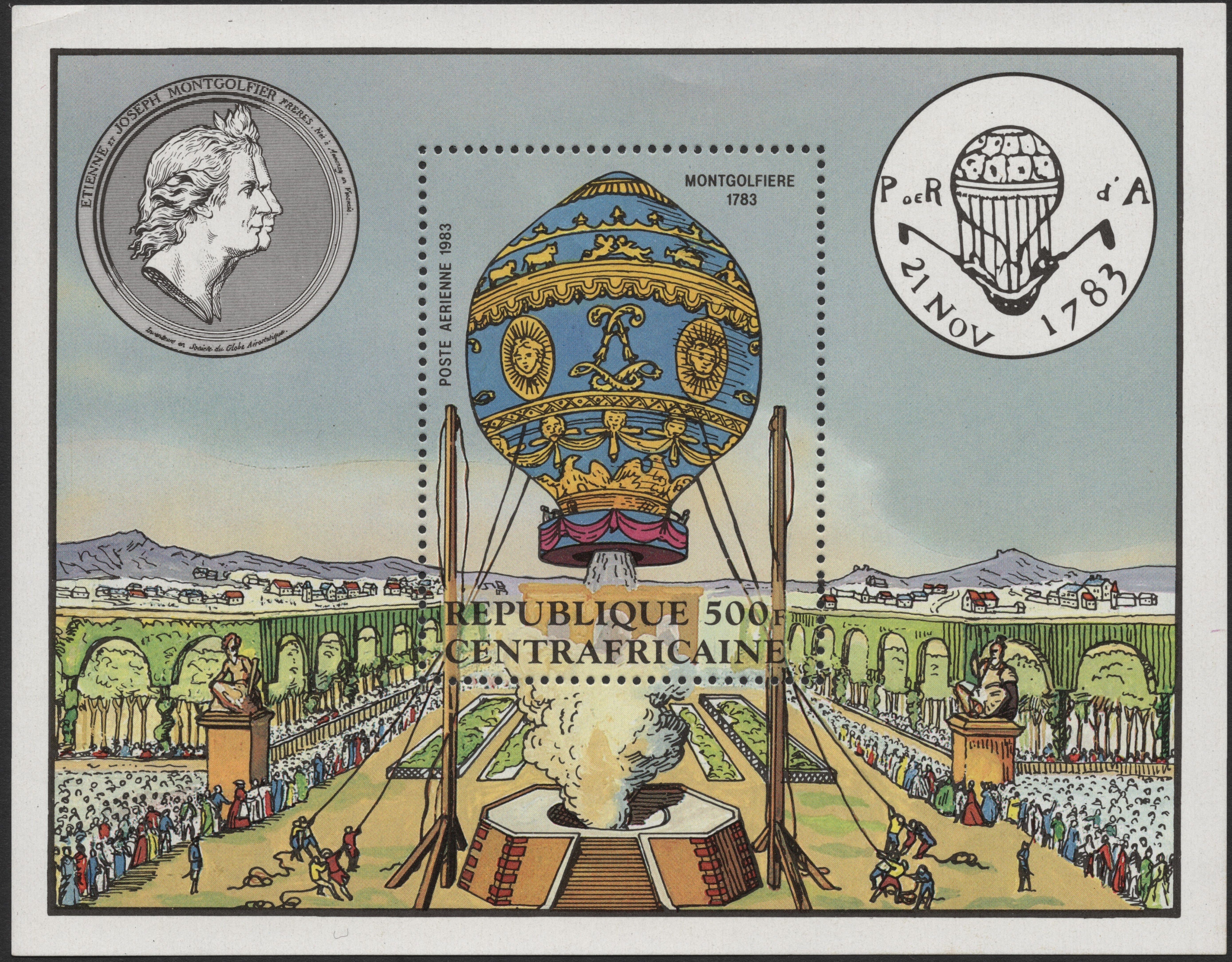 Rs. 70.00Rs. 70.00/This vibrant 1983 souvenir sheet from the Central African Republic commemorates the historic first manned hot air balloon flight by the Montgolfier brothers in 1783. The...