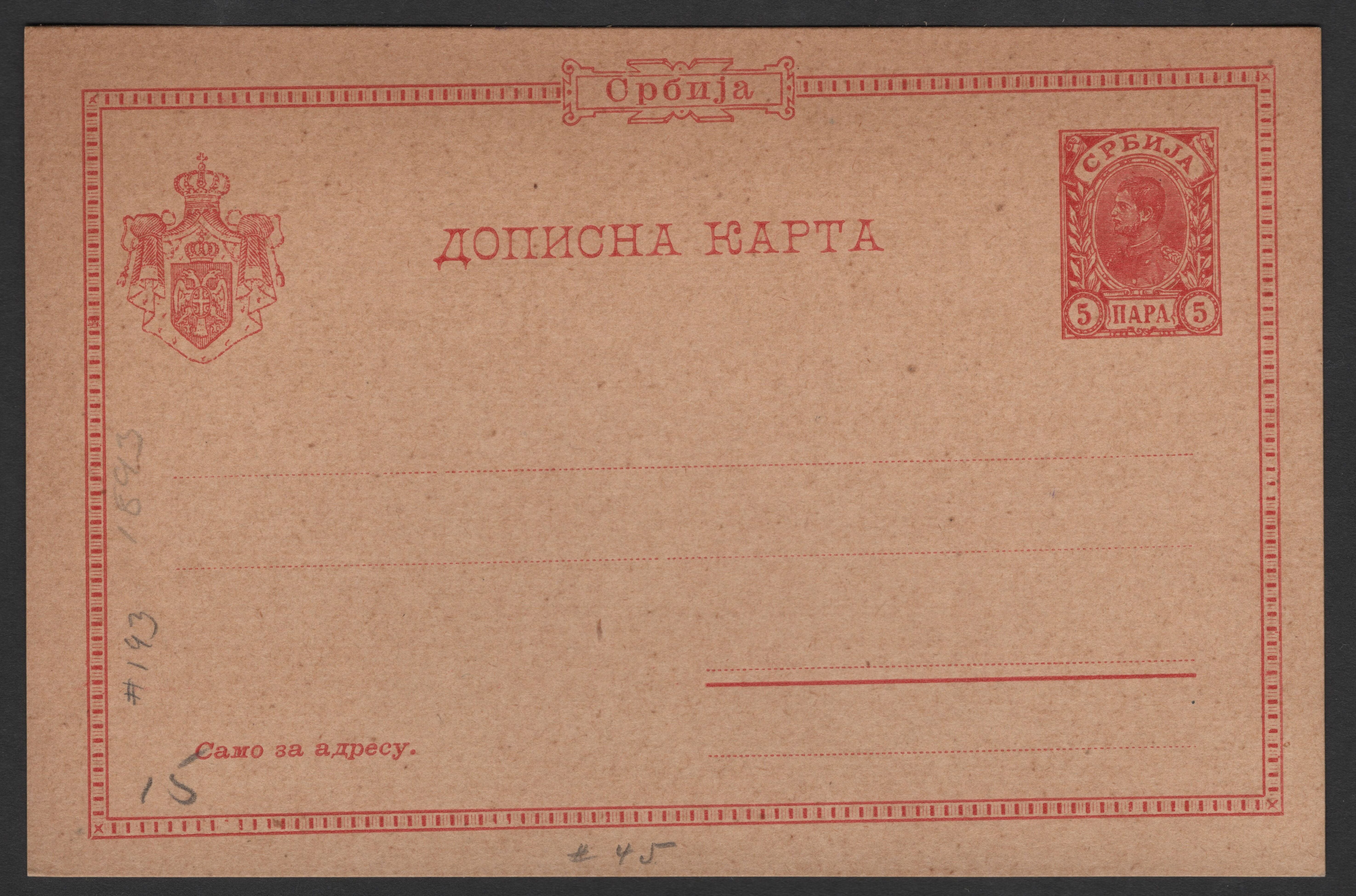 Rs. 120.00Rs. 120.00/This unused postal stationery card from the Kingdom of Serbia features a 5 para red imprint with the profile of King Alexander I Obrenović. Issued around...