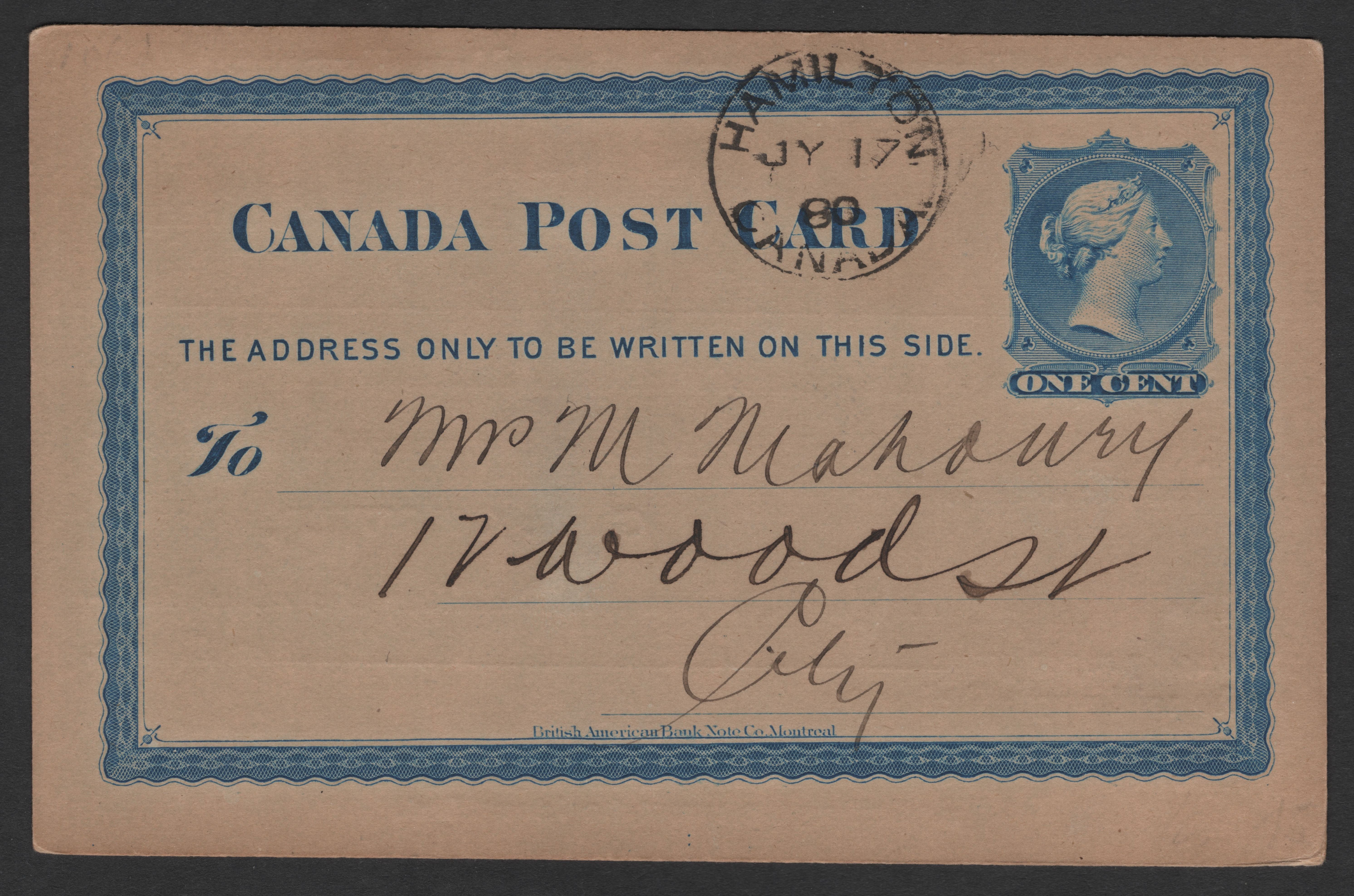 1 cent postal card, issued in the 1870s–80s, features a blue indicium with the profile of Queen Victoria and was used on July 17, 1880. Sent...