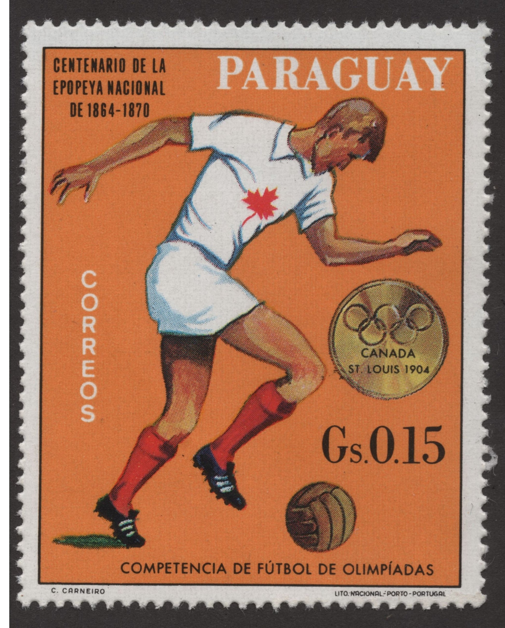 This striking stamp set from Paraguay commemorates historical Olympic football tournaments alongside the Centenary of the National Epic (1864–1870) . Featuring vintage football scenes, the stamps highlight Olympic achievements by various nations: Canada (1904 St. Louis) Great Britain (1908 London 1912 Stockholm) , and Belgium (1920 Antwerp) . Designed by C. Carneiro and printed in Portugal, these colorful stamps blend sports history with national pride.