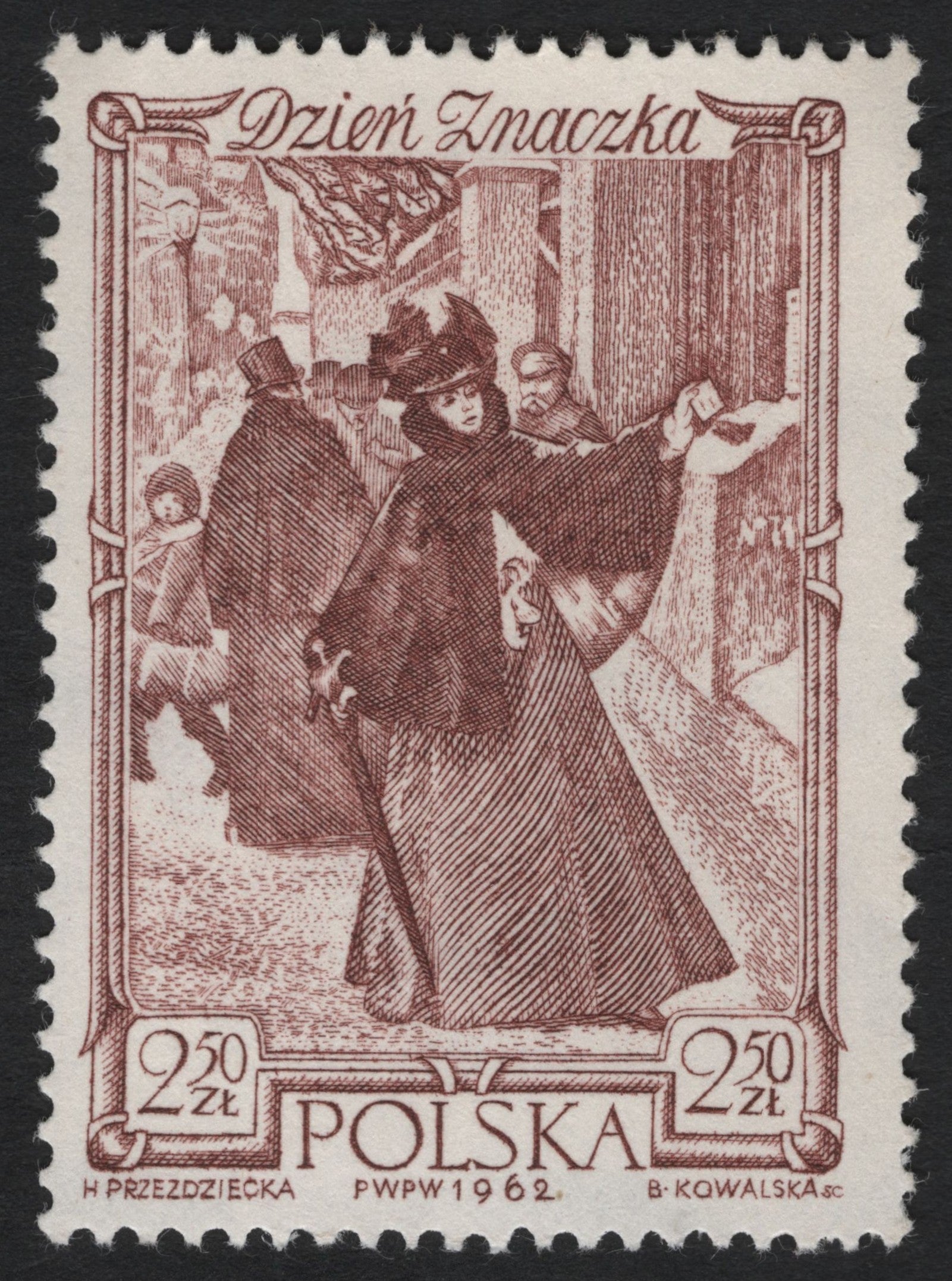 Issued in 1962, this Polish commemorative celebrates Dzień Znaczka (“Stamp Day”), a tradition honoring philately and postal heritage. The monochrome sepia-brown design depicts a finely engraved 19th-century street scene, with a woman in period dress mailing a letter—symbolizing the enduring cultural significance of written communication. Engravers H. Przedzdiecka and B. Kowalska create rich texture and depth typical of mid-century Polish intaglio work. A classic addition for collectors of postal history, engraved art, and Eastern European commemoratives.