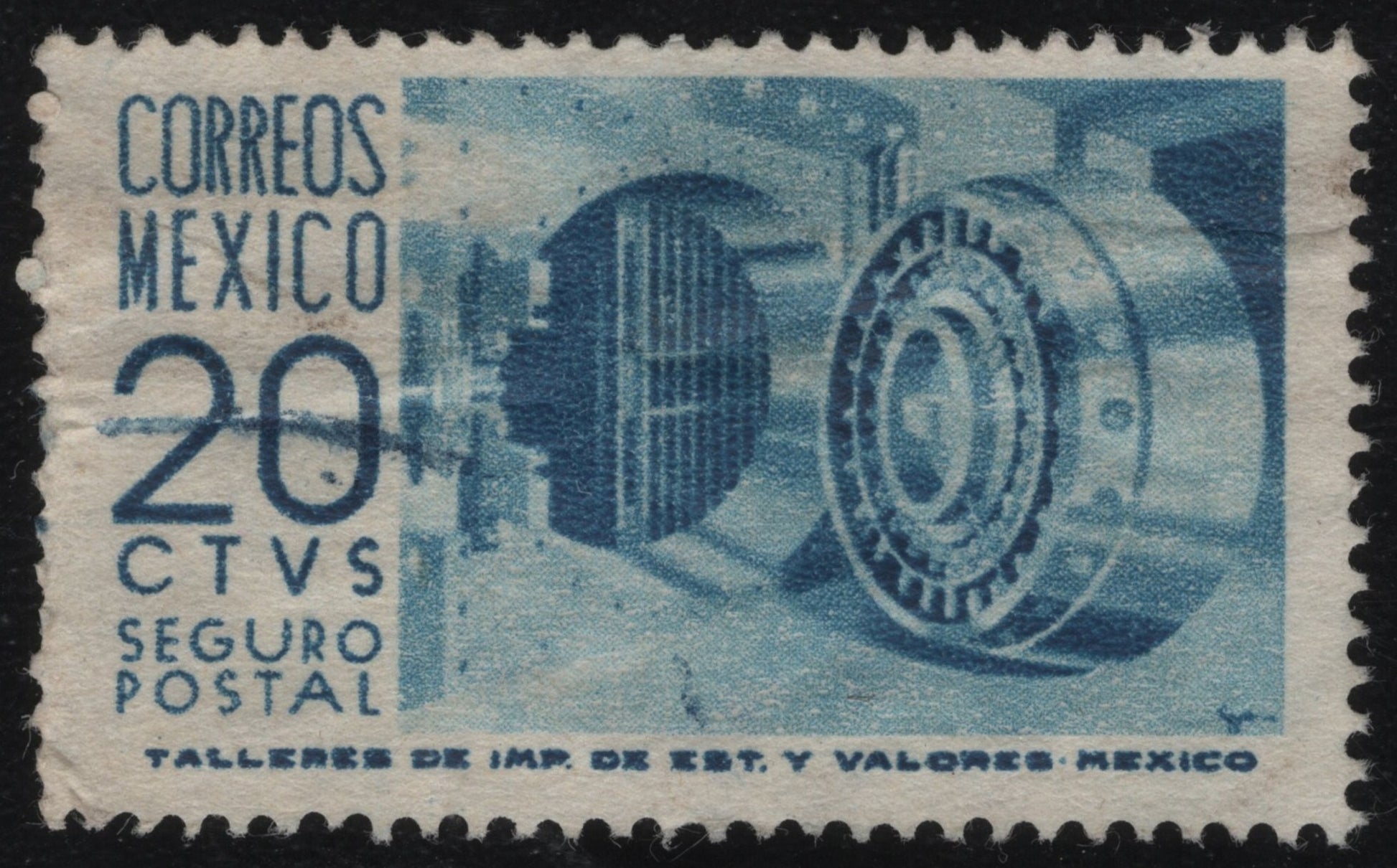This used Mexican stamp, valued at 20 centavos, features a detailed image of a heavy vault door, symbolizing security and protection. It was issued for Mexico's "Seguro Postal" or postal insurance service, ensuring safer mail delivery. Printed in striking blue tones, the design emphasizes trust in the postal system. Postmark traces confirm its postal usage, adding to its historical and philatelic value.