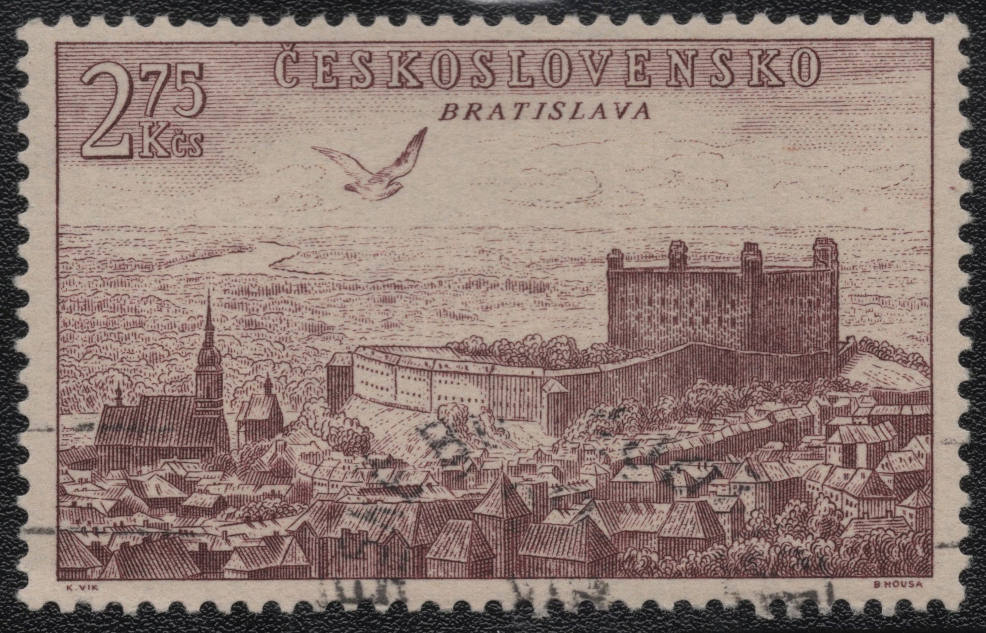 This used 2.75 Kčs stamp from Czechoslovakia features a finely detailed engraving of Bratislava with the historic Bratislava Castle dominating the skyline. Issued mid-20th century, it beautifully captures the city's architectural landscape, including its church spires and dense rooftops. Ideal for collectors of European landmarks, cityscapes, and historical architecture in engraved stamps.