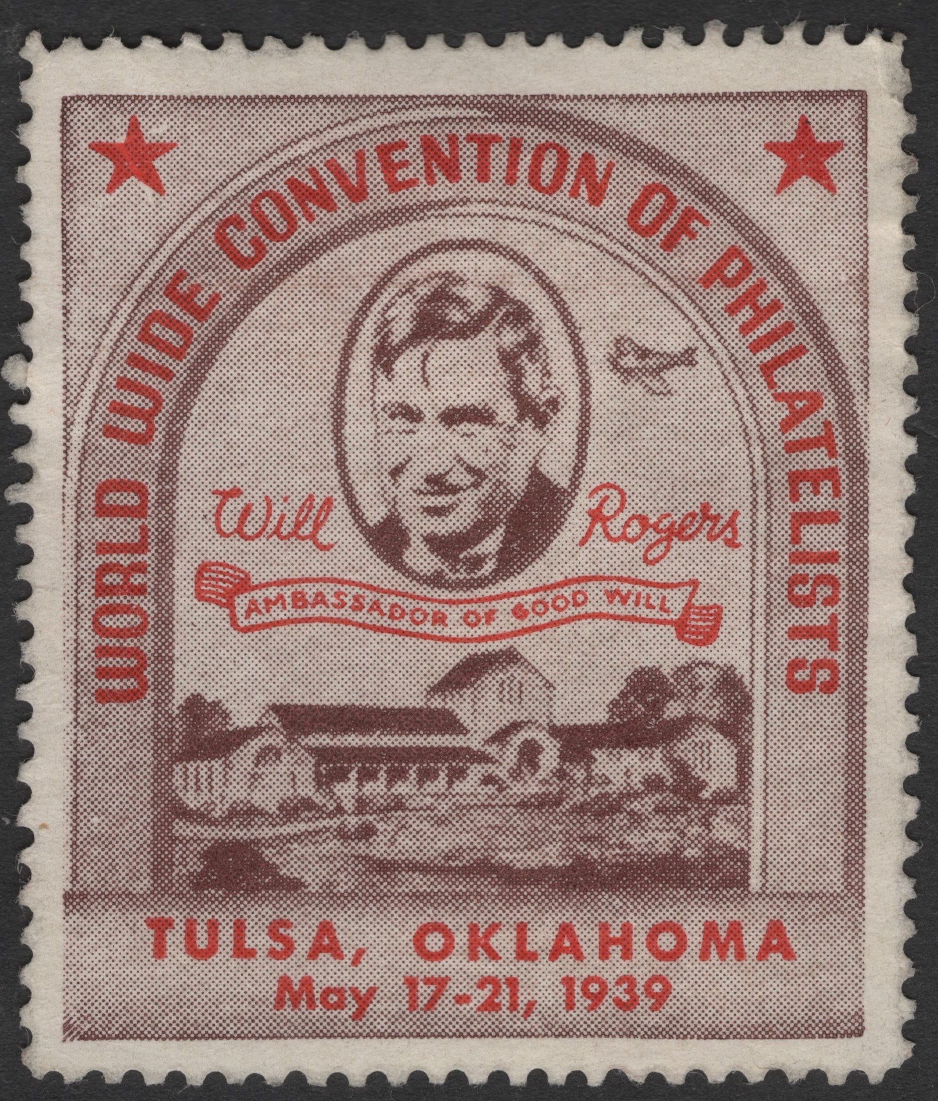 This cinderella stamp was issued for the World Wide Convention of Philatelists held in Tulsa, Oklahoma end="255" May 17–21, 1939. It features humorist and goodwill ambassador Will Rogers, alongside symbolic red stars and his homestead. A classic collectible for philatelic event label collectors and Americana enthusiasts.