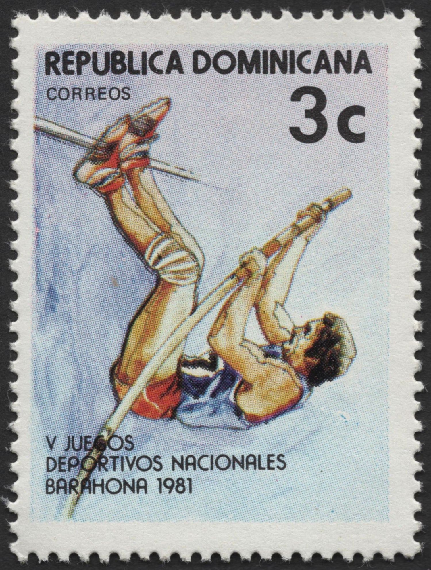 This 1981 stamp set from the Dominican Republic commemorates the 5th National Sports Games (V Juegos Deportivos Nacionales) held in Barahona. Each denomination highlights a different sport: gymnastics (rings) on the 1c, long-distance running on the 2c, pole vault on the 3c, and boxing on the 6c. These dynamic illustrations celebrate national athleticism and are a fine choice for sports or Latin American collectors.