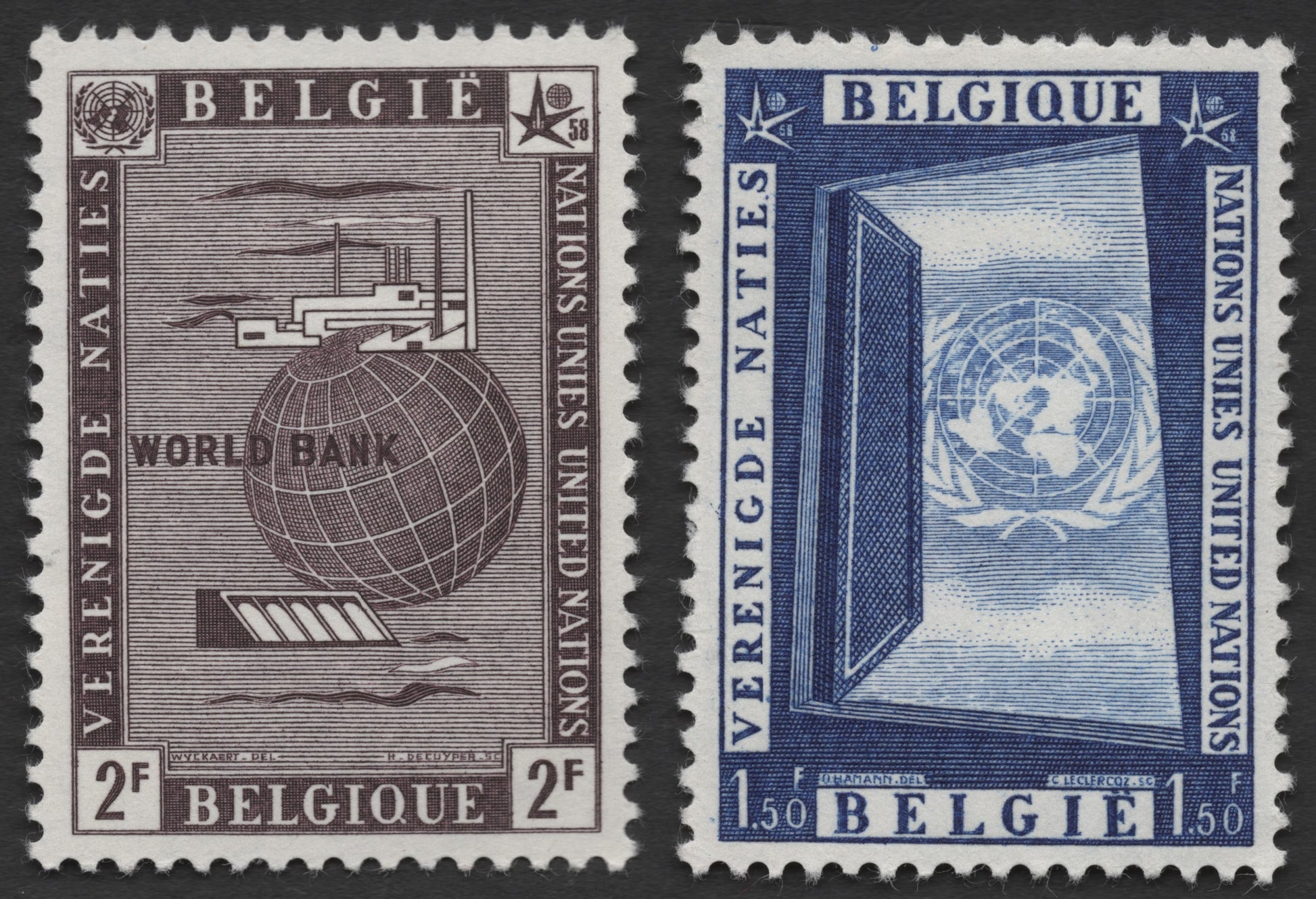 These Belgian stamps highlight the nation’s support for international cooperation through key global institutions. The brown 2F stamp depicts the World Bank symbolically represented by a globe and industrial backdrop, reflecting development and economic aid. The blue 1.50F stamp features the UN emblem emerging from an open book, symbolizing diplomacy, peace, and global unity. Both stamps are inscribed “Nations Unies” and “Verenigde Naties” in French and Dutch, representing Belgium’s bilingual heritage.