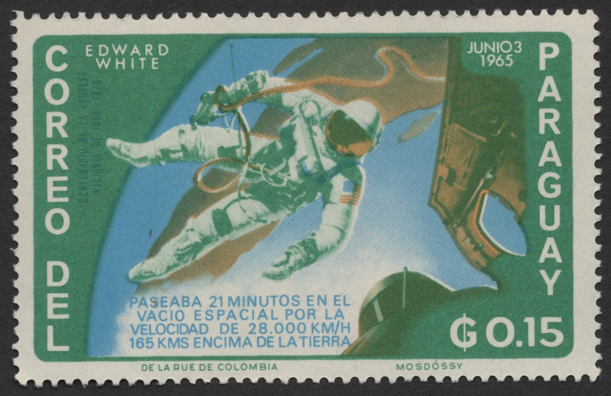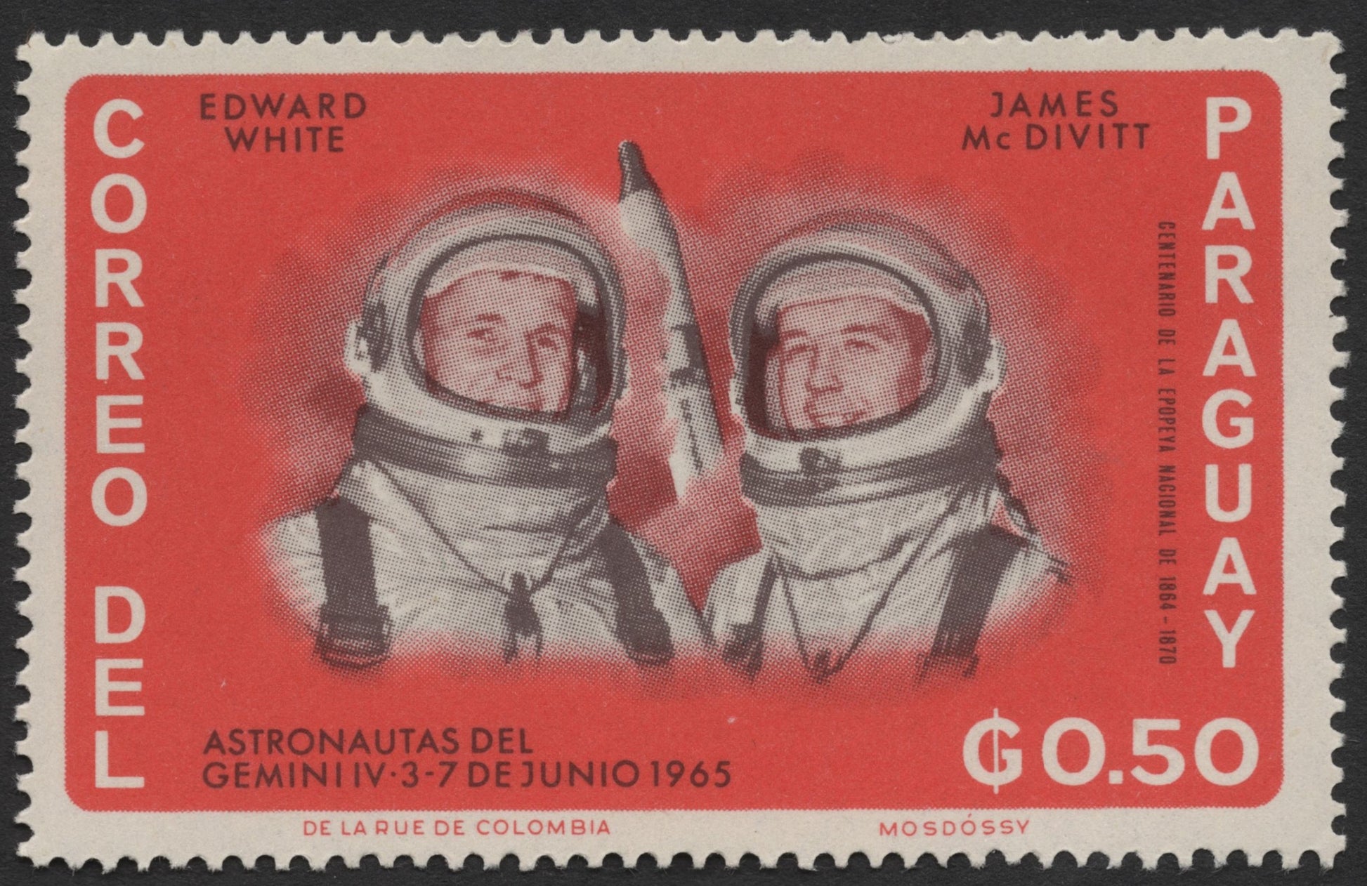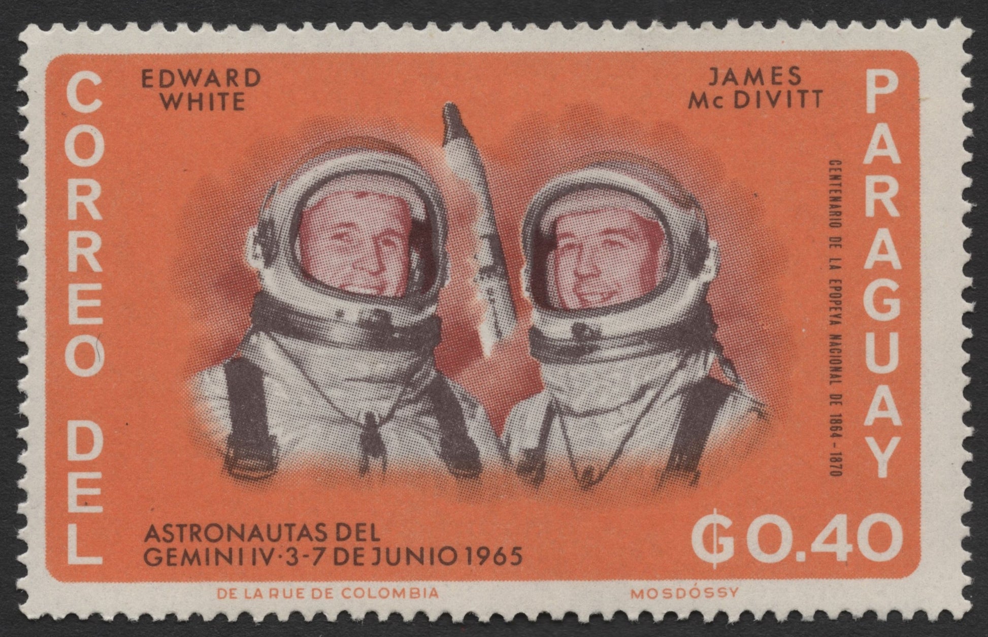This colorful stamp set from Paraguay honors key missions of NASA’s Gemini space program during 1965. Featured are astronauts Edward White, James McDivitt, John W. Young, and Virgil Grissom, with notable missions such as Gemini III, IV, VI, and VII. One stamp highlights Edward White's historic spacewalk, the first EVA by an American. With vivid illustrations and technical data, these stamps celebrate human achievement in space exploration. Printed by De La Rue de Colombia and designed by Mosdossy.