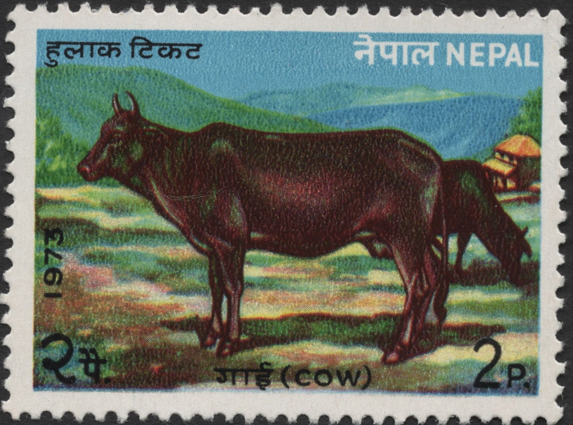 Issued in 1973, this 2 paisa stamp from Nepal features a native cow against a scenic backdrop of terraced fields and traditional village huts. The cow, a sacred and culturally significant animal in Nepal, is shown in a peaceful, pastoral setting. With inscriptions in both Nepali and English, this stamp reflects the country’s agricultural heritage and religious symbolism. A fine thematic piece for collectors of livestock, culture, or South Asian issues.