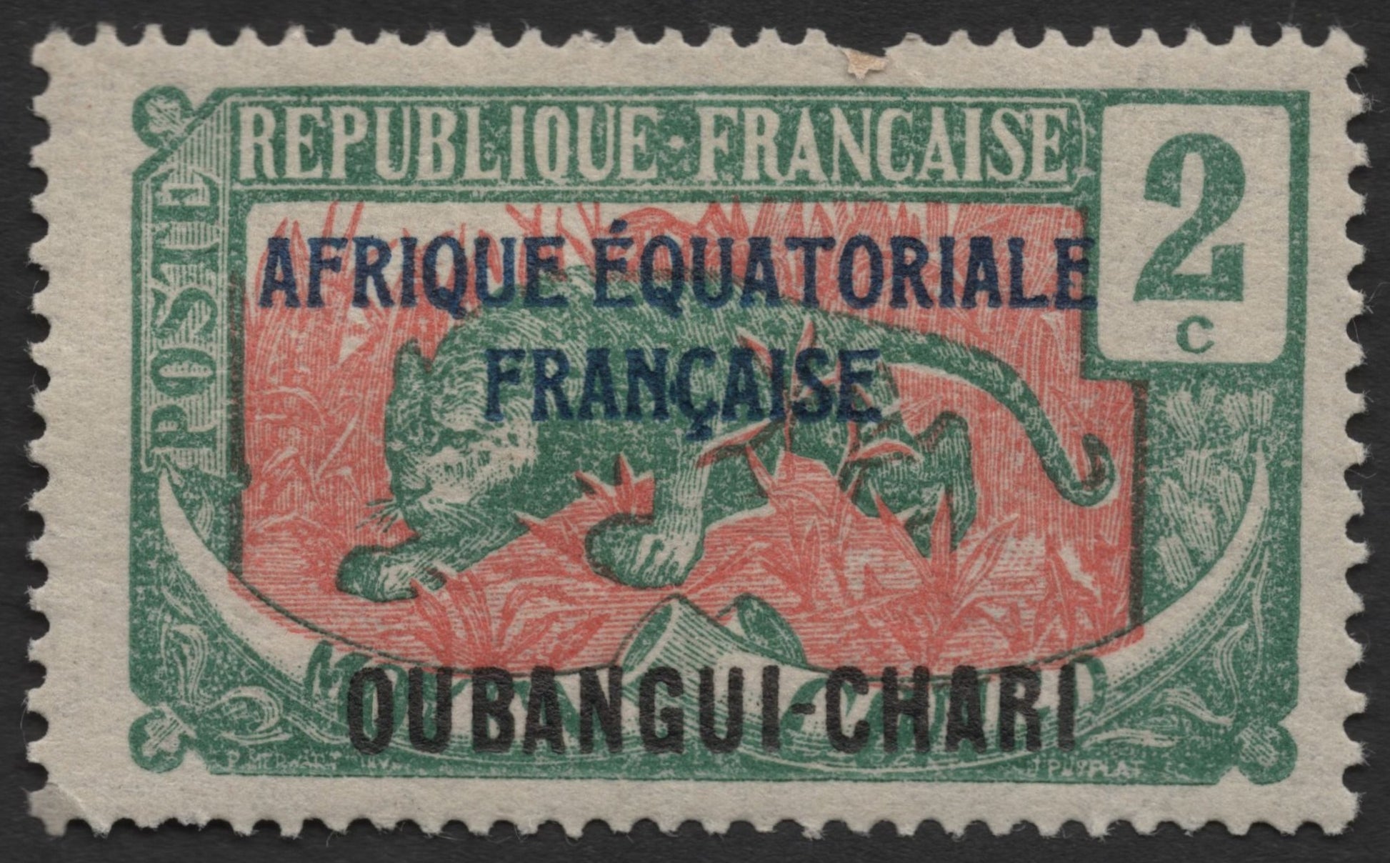This 2 centimes stamp was originally issued by end="167"République Française and later overprinted for use in is-only-node=""Ubangi-Shari(Oubangui-Chari), a territory within . The stamp features a green and red design depicting a crouching leopard among vegetation, a nod to the region’s wildlife. The dual overprints emphasize colonial administration and postal adaptation.