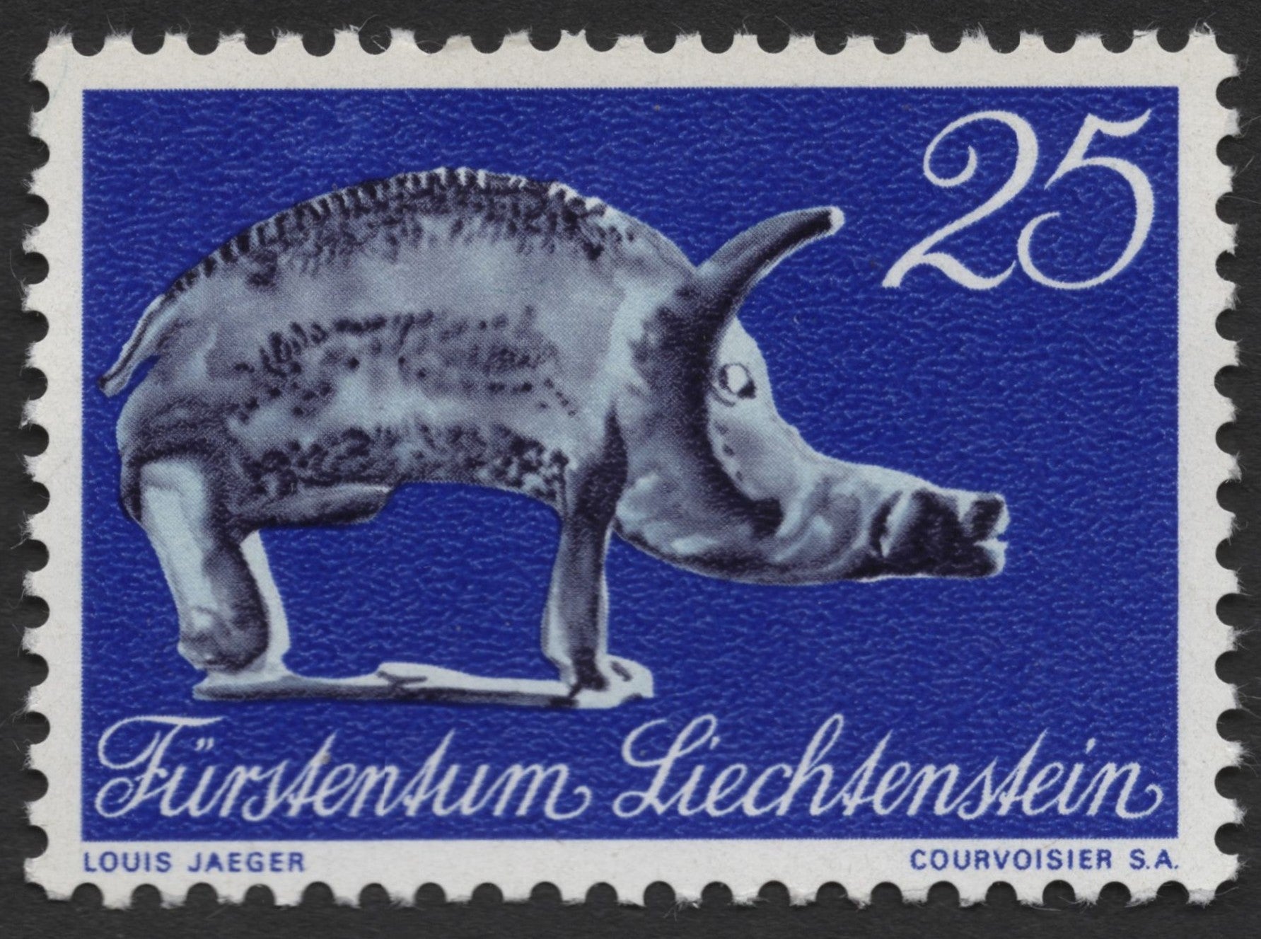This 25-rappen stamp from Liechtenstein features an artistic depiction of an aardvark, created by Louis Jaeger. With a deep blue background and stylized illustration, it is part of a series showcasing unique or exotic wildlife. Printed by Courvoisier S.A., this issue blends zoological interest with graphic elegance, making it a fine collectible for animal and design-themed philately.