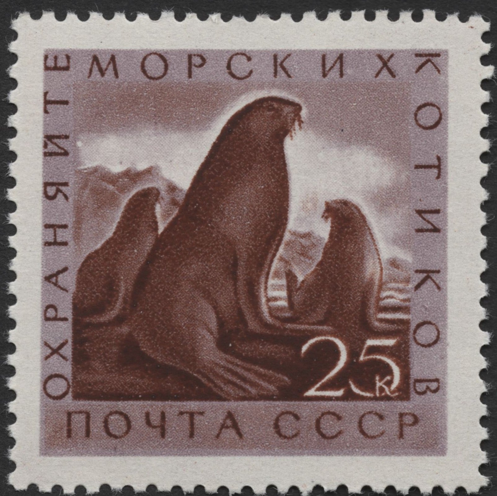 Issued by the Soviet Union, this 25 kopeck stamp features a powerful image of northern fur seals (also known as sea lions) against a mountainous coastal backdrop. The Russian text translates to "Protect the Sea Lions," emphasizing wildlife conservation efforts during the era. Printed in deep brown tones, this 1960s–70s era stamp is a valued collectible highlighting Soviet ecological themes and marine fauna.