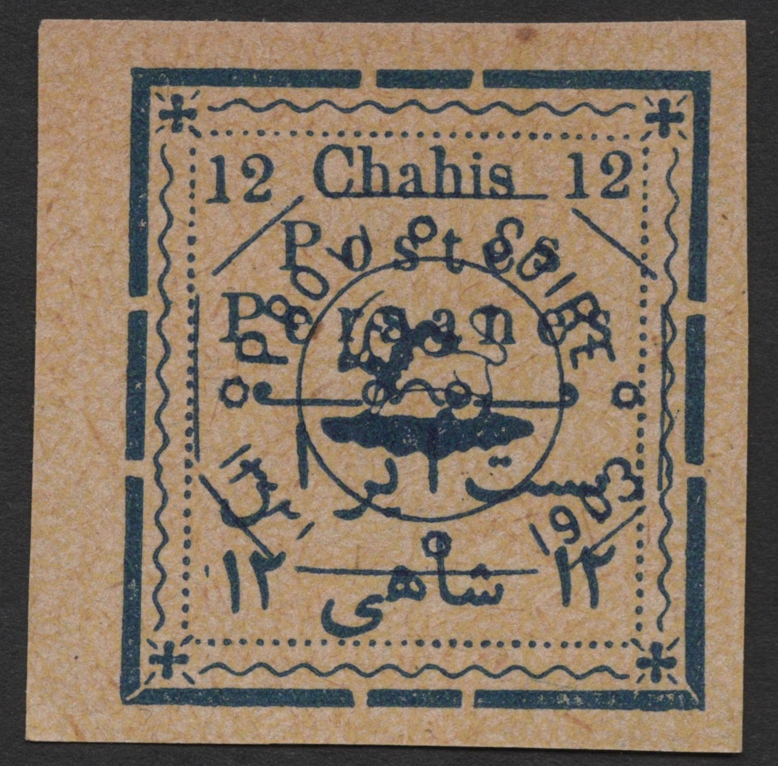 This 1903 stamp from Persia (Iran) features a deep blue 12 Chahis Lion and Sun design on thin buff paper. Issued during the Qajar dynasty, it bears both French and Persian inscriptions, with a bold circular black cancellation that includes a partial date and script. Highly collectible for its classic typography and historical postal markings.
