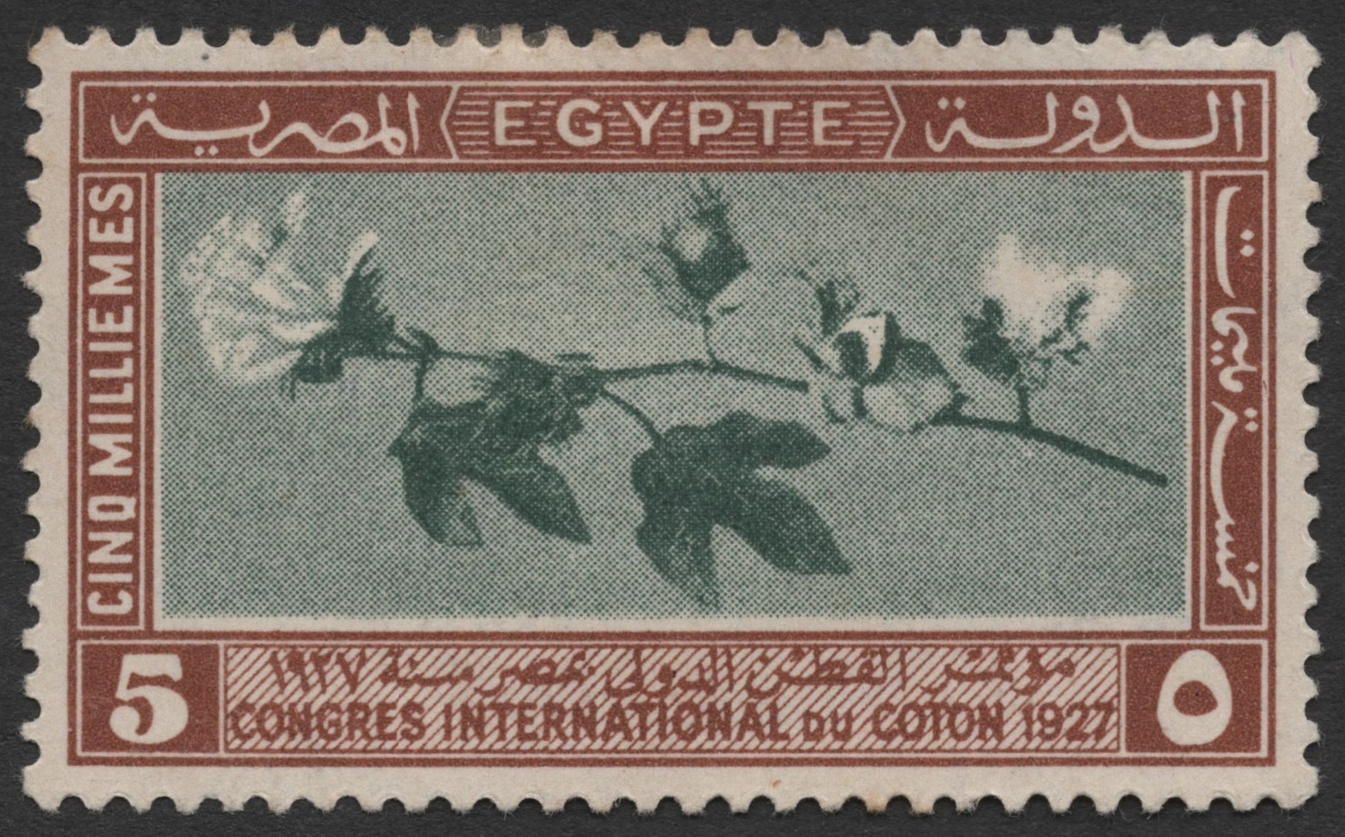 This 5 milliemes stamp was issued by Egypt in 1927 to commemorate the International Cotton Congress held that year. It features a detailed illustration of a cotton plant, emphasizing the importance of cotton to Egypt’s economy and agriculture. Printed in a two-tone design with Arabic and French inscriptions, this early commemorative issue is a valuable item for collectors of agricultural themes and early 20th-century Egyptian philately.