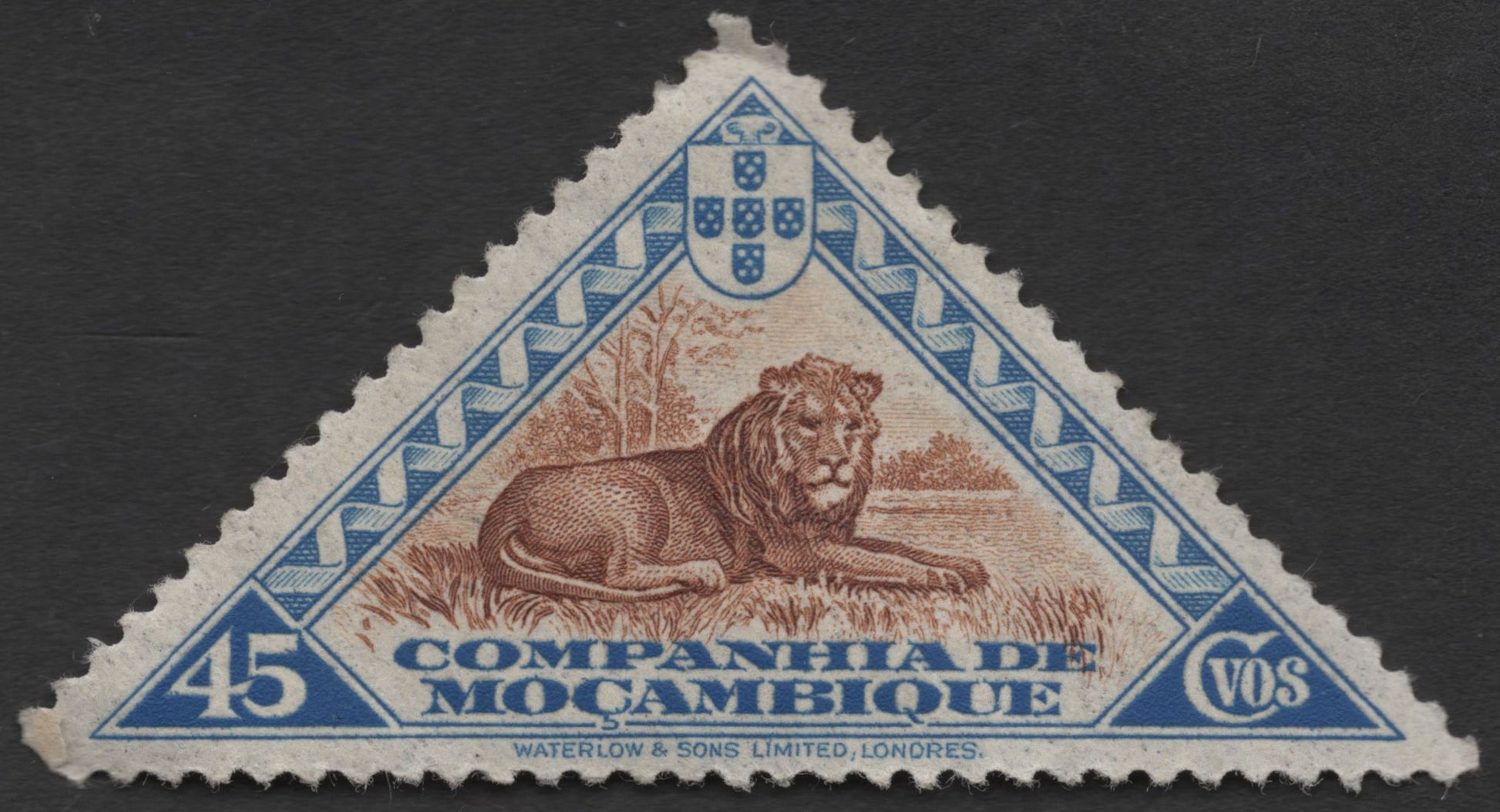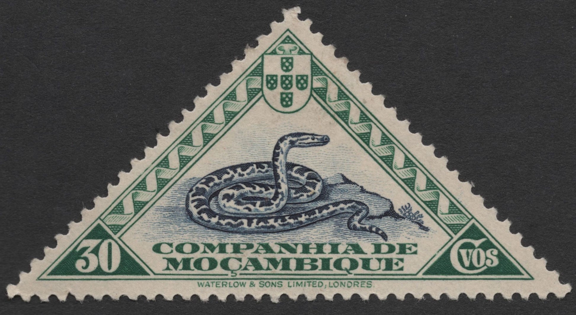 These striking triangular stamps were issued by the Companhia de Moçambique (Mozambique Company), a chartered company under Portuguese colonial rule. The 45 centavos stamp depicts a majestic lion, while the 30 centavos stamp shows a coiled snake. Printed by Waterlow & Sons Ltd., London, these stamps are known for their high-quality engraving and distinctive shape, making them standout pieces for collectors of African colonial and zoological themes.