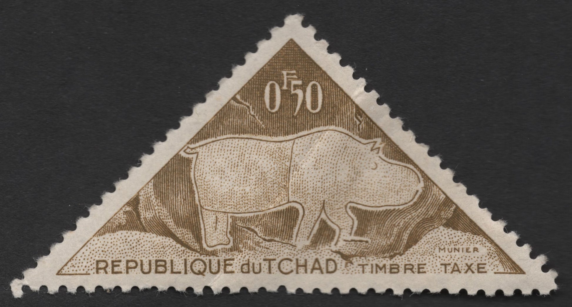 This triangle-shaped postage due set from the Republic of Chad depicts ancient rock engravings of animals found in the Sahara's Ennedi Plateau. Issued in the 1960s, the designs highlight native species such as the hippopotamus (0.50F, brown), antelopes (1F, blue), and oxen or wild cattle (2F, red). These stamps pay tribute to Chad's cultural and prehistoric heritage, and are widely sought after by collectors of African wildlife and triangular issues.