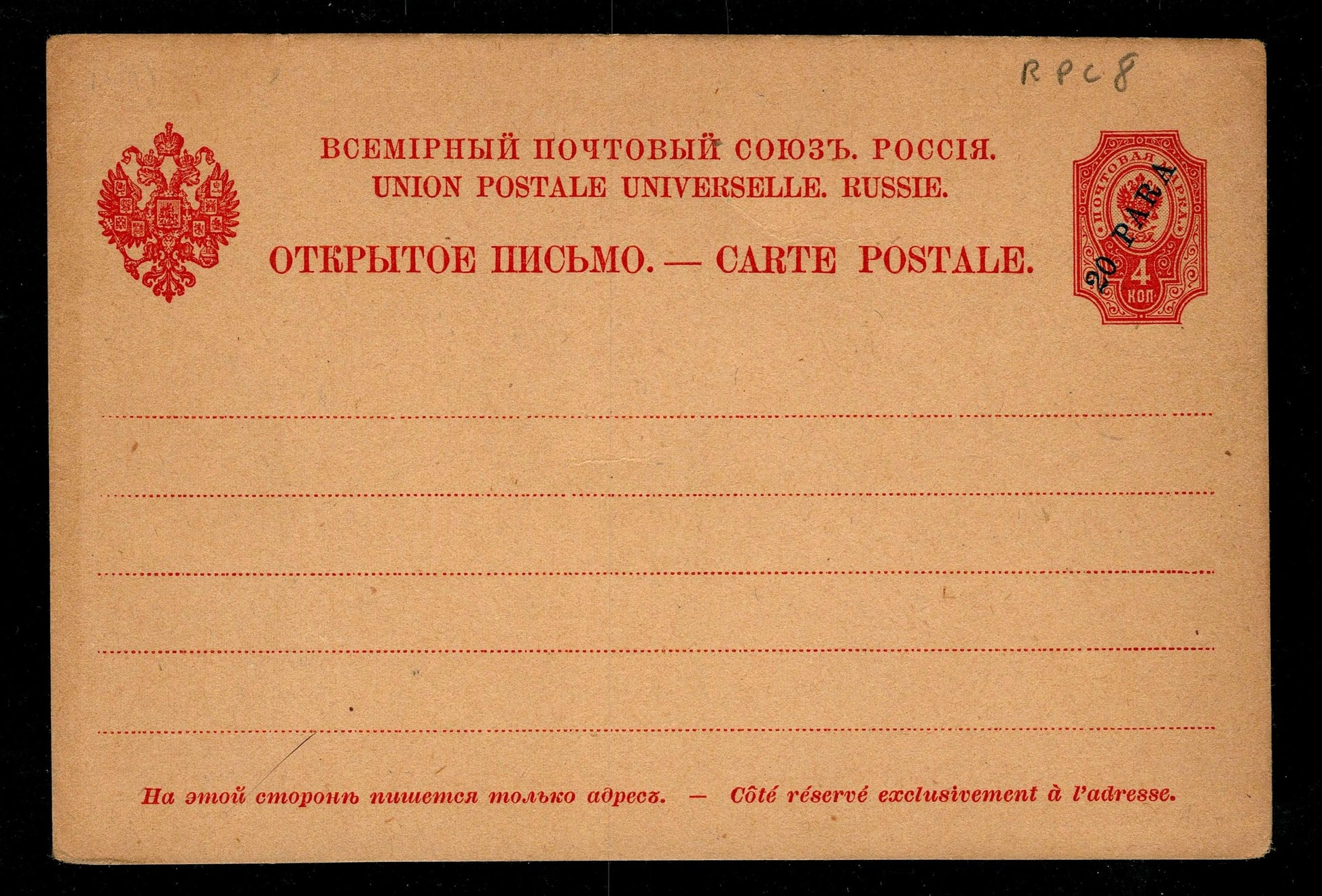 This vintage postal card from Imperial Russia bears a 4 kopeck red indicium featuring the Romanov double-headed eagle. Issued under the Universal Postal Union (UPU), it showcases trilingual text in Russian, French, and partially Latinized script. The design is clean and intended exclusively for address information on the front. This piece offers a fine example of pre-Soviet postal stationery, ideal for collectors of classic Russian philately or UPU postal history.