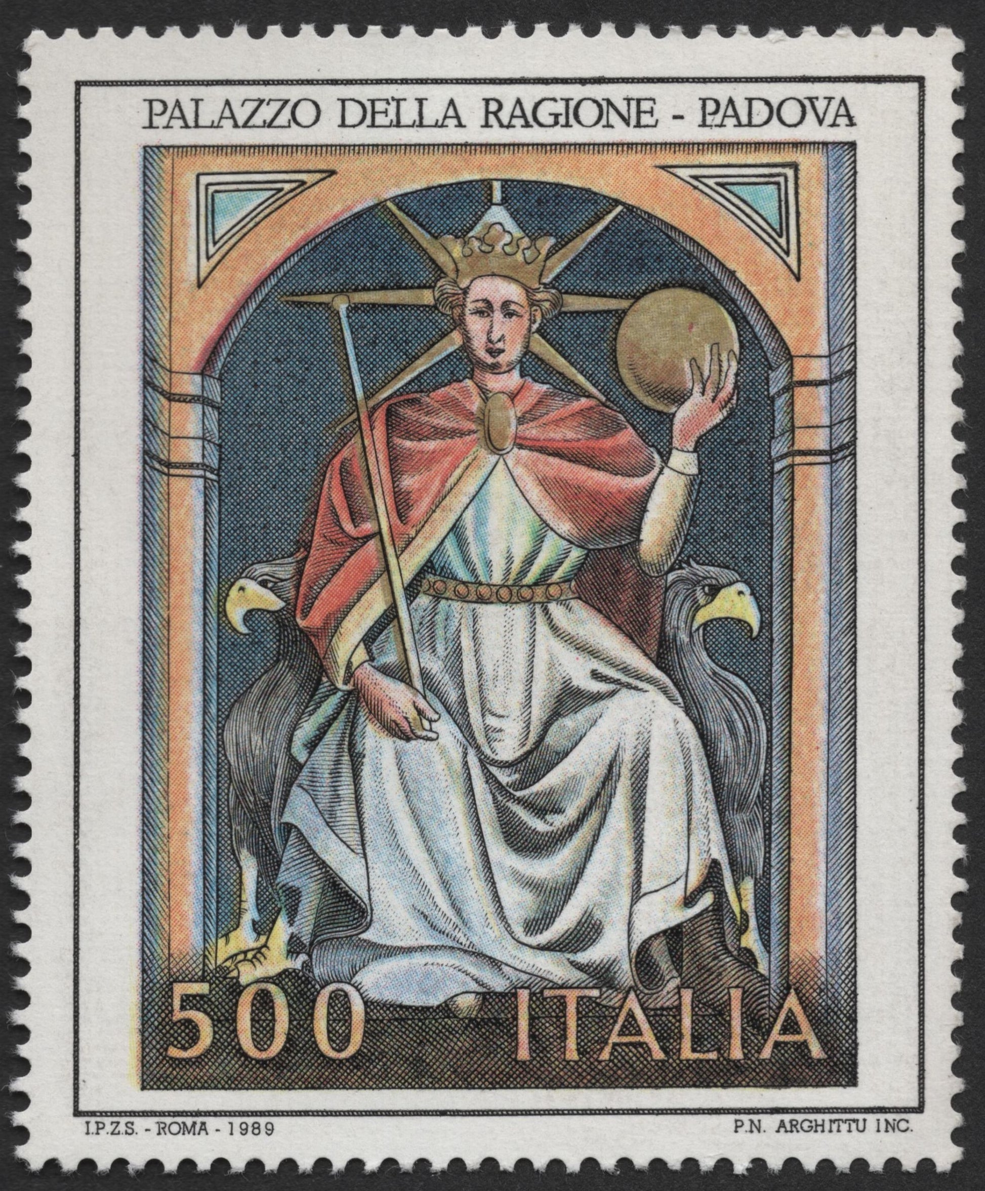This 500 Lire stamp from Italy, issued in 1989, features a vivid reproduction of medieval fresco artwork from the Palazzo della Ragione in Padua. The design shows a crowned figure holding an orb and scepter, symbolizing justice or wisdom, seated between two eagles. A tribute to Italian civic heritage and medieval art, the stamp highlights Padua’s renowned architectural and historical legacy.