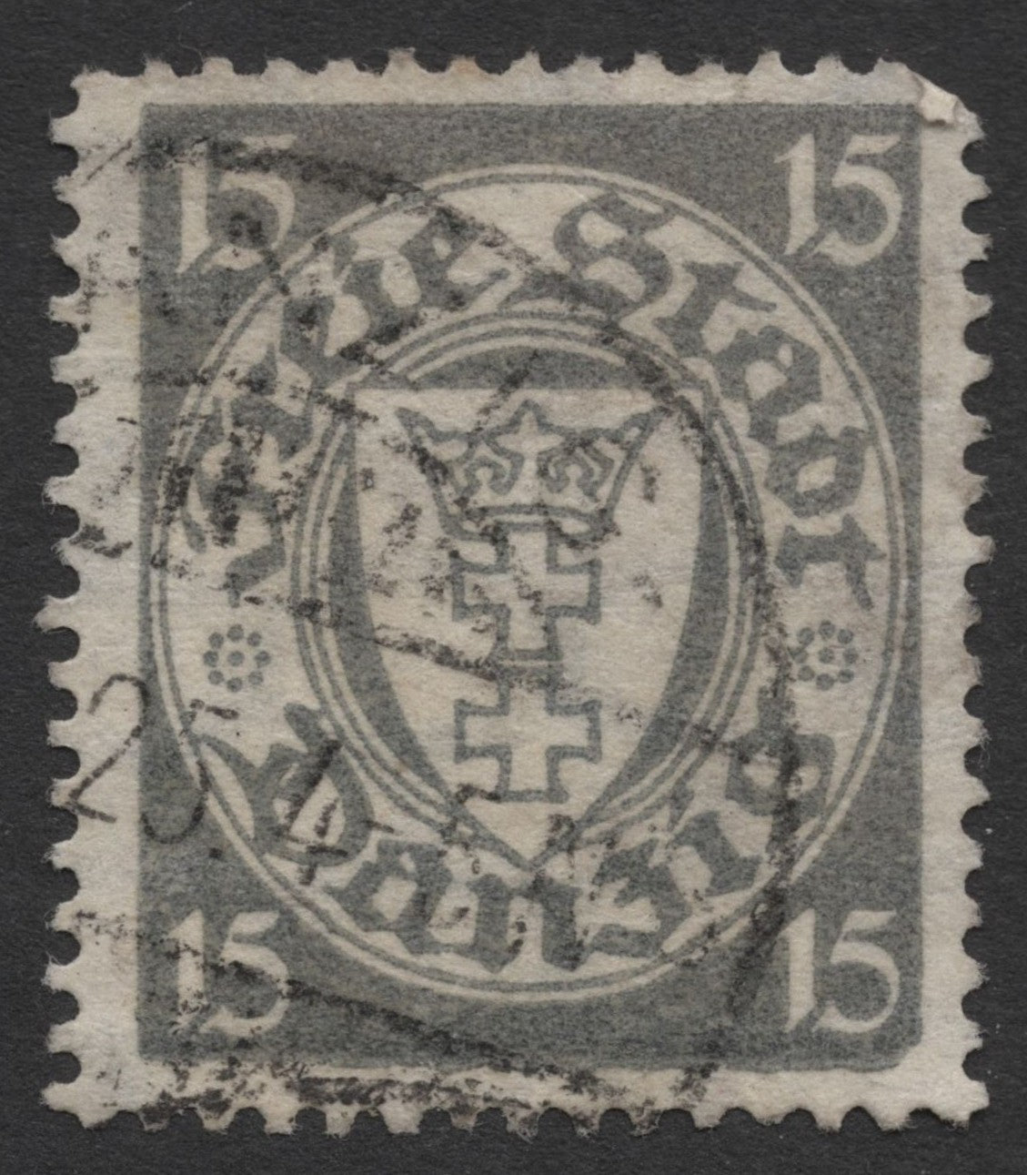 This 15 Pfennig used stamp from the Free City of Danzig, issued in 1920, displays the city's coat of arms—two white crosses beneath a crown—set within an ornate black oval design. The words “Freie Stadt Danzig” appear in Gothic script around the central emblem. Issued under the League of Nations mandate, it's a key issue from Danzig’s short-lived independent postal history.