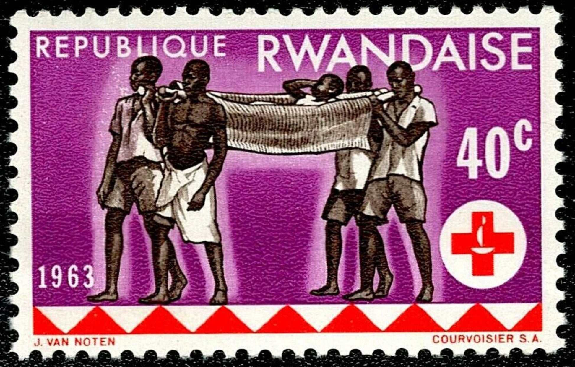 Issued in 1963 by Rwanda, this 40 centimes stamp honors the humanitarian work of the Red Cross. It shows local individuals carrying a patient in a stretcher, symbolizing emergency relief in rural areas. The design, marked with the red cross and torch emblem, was created by J. Van Noten and printed by Courvoisier S.A.