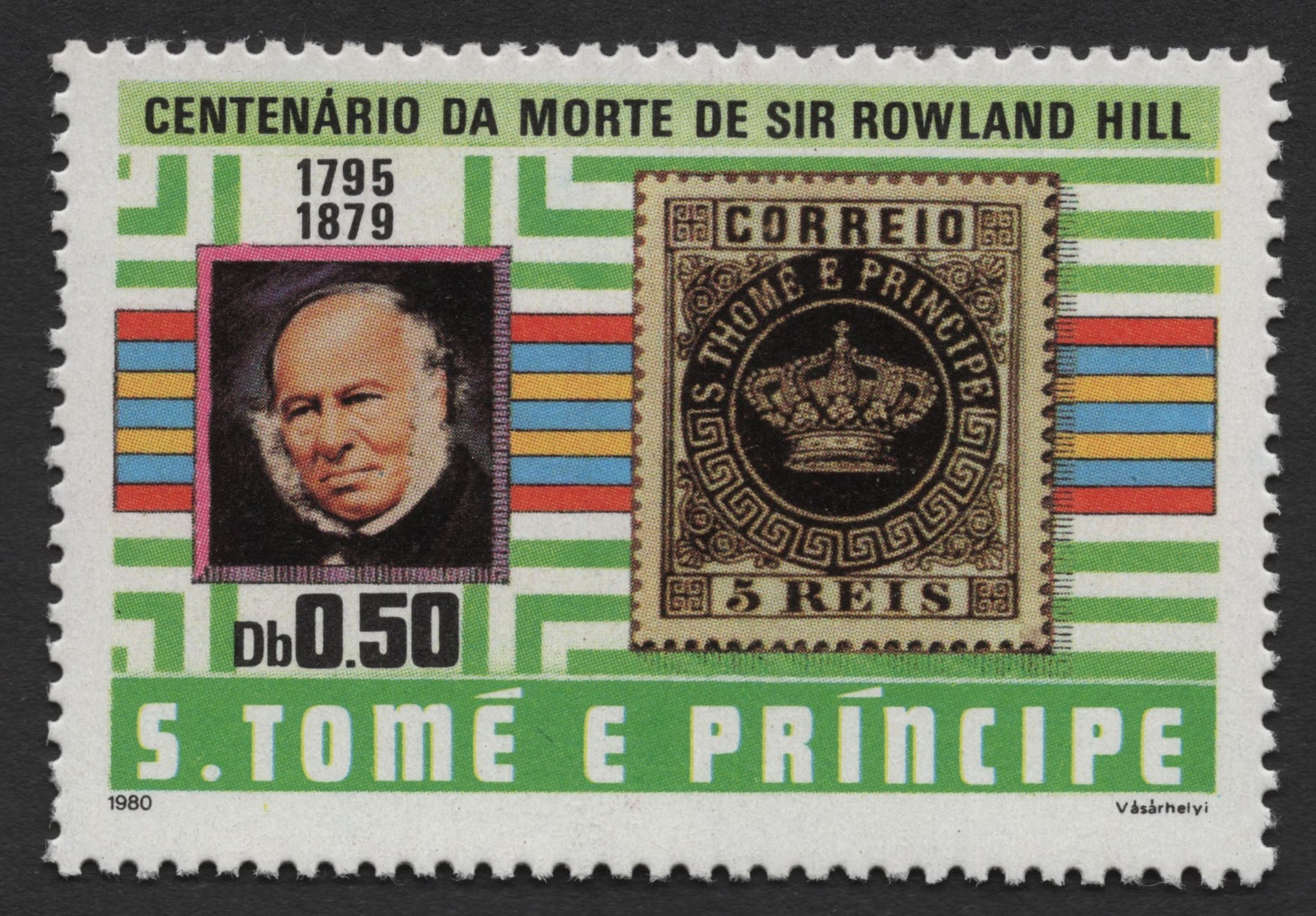 Issued in 1980 by São Tomé and Príncipe, this commemorative stamp honors the 100th anniversary of Sir Rowland Hill's death (1795–1879), the father of modern postage. The design features a portrait of Hill alongside a classic 5 Reis stamp from the nation's early issues, forming a striking stamp-on-stamp composition celebrating postal reform and philatelic history.