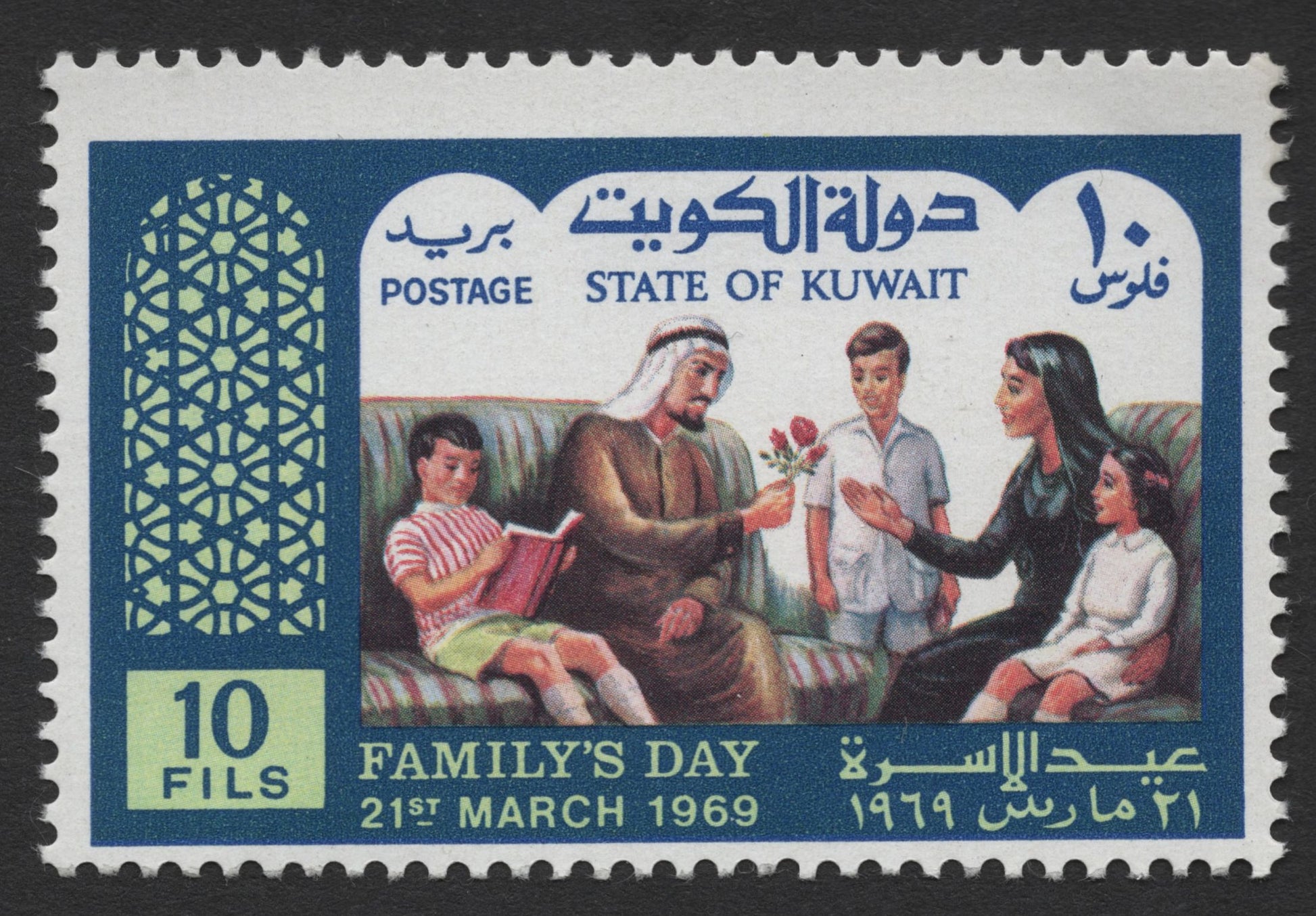 Issued by the State of Kuwait on 21st March 1969, this set of 10 fils and 20 fils stamps celebrates node="" Family’s Day, highlighting the central role of family in Kuwaiti society. Both stamps depict a warm domestic scene with a father, mother, and children sharing a moment—symbolizing unity, love, and cultural values. The intricate Islamic geometric pattern on the left adds a traditional aesthetic to this modern commemorative issue.