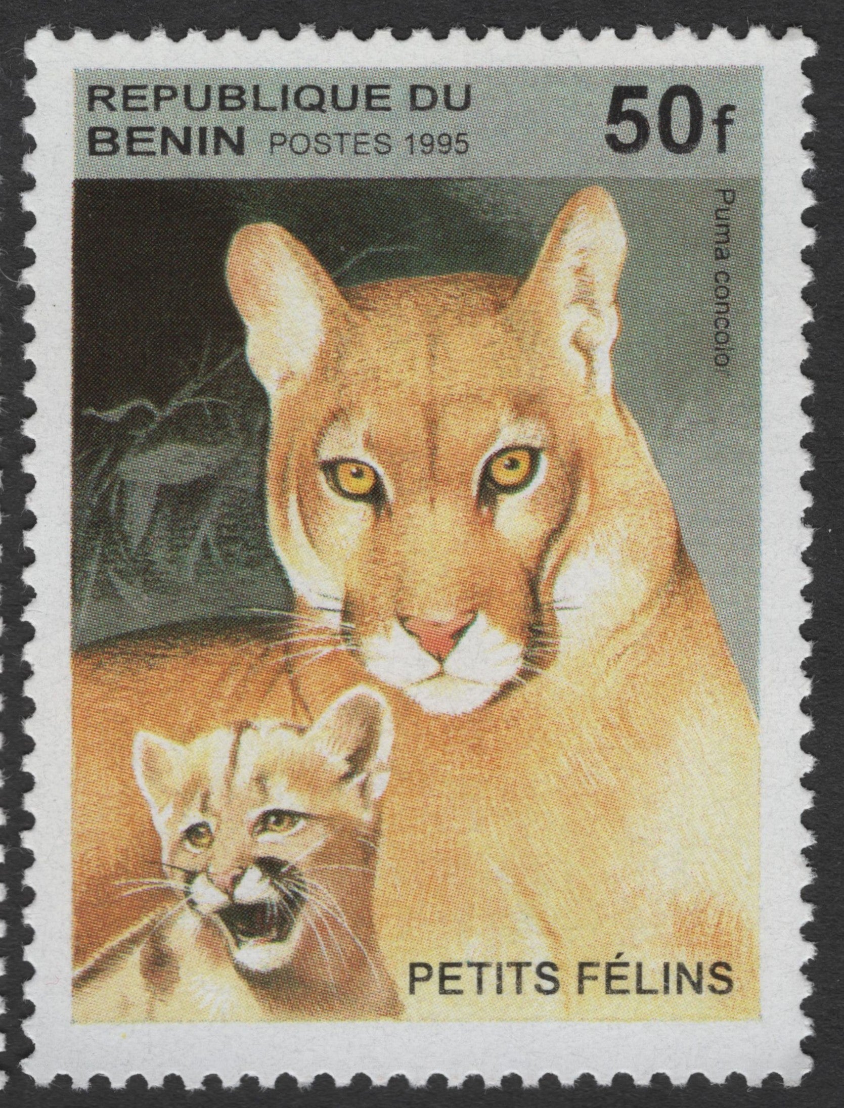 Issued by the node="">République du Bénin in 1995, this pair of stamps features beautifully illustrated members of the wild feline family. The 40f stamp depicts two Eurasian lynxes (Lynx lynx) resting affectionately, while the 50f stamp shows a puma (Puma concolor) with its playful cub. Part of the Petits Félins (Small Cats) series, these stamps are popular among collectors of wildlife and big cat themes.