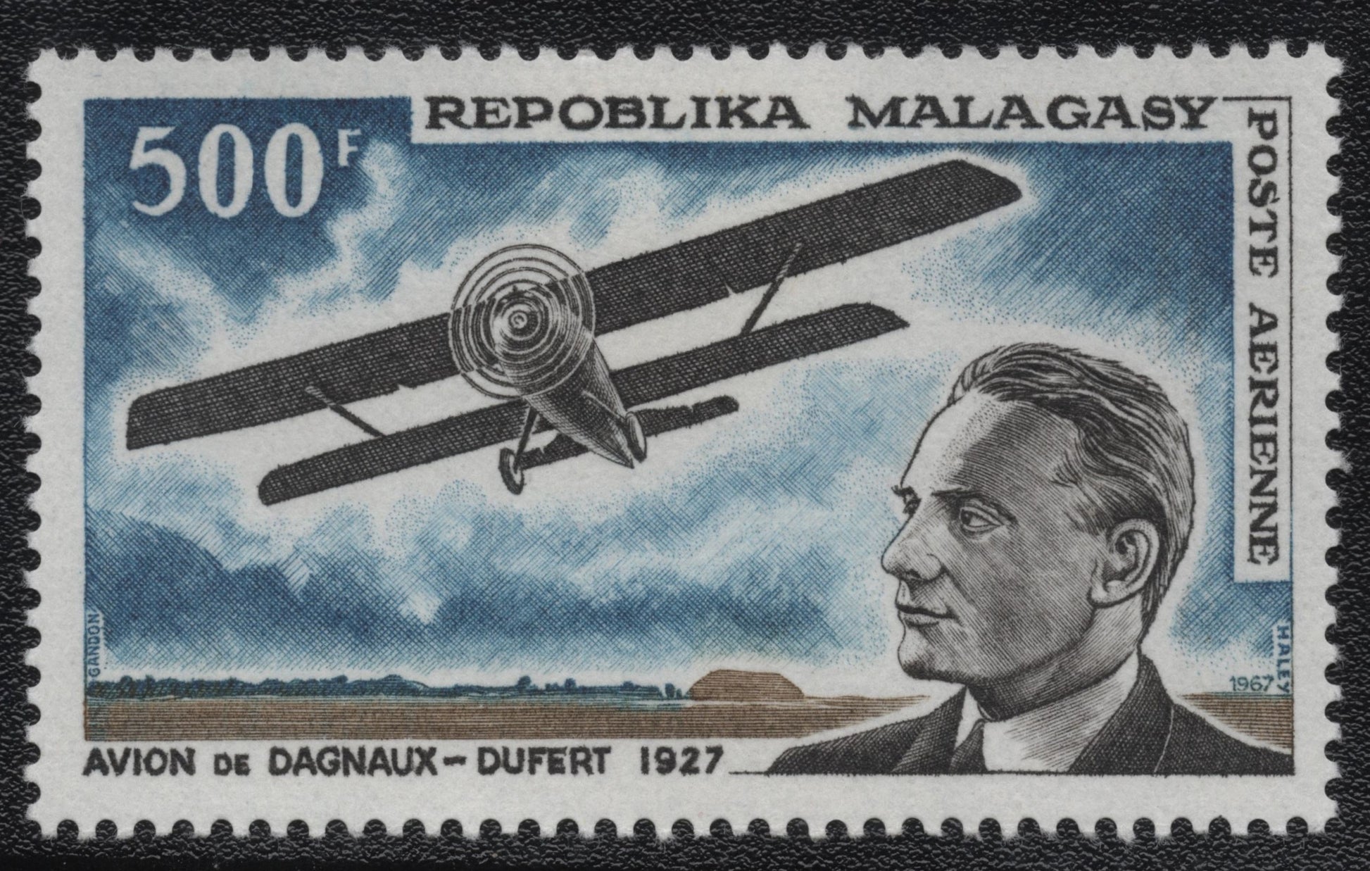 Issued by the Malagasy Republic in 1967, this 500 Franc airmail stamp honors early aviation pioneers with a depiction of the Dagnaux-Dufert biplane from 1927. It features a finely engraved portrait of one of the aviators alongside the aircraft in mid-flight. Designed by Pierre Gandon and engraved by Claude Haley, it reflects classic French-influenced philatelic artistry. A desirable item for collectors of aviation or airmail themes.