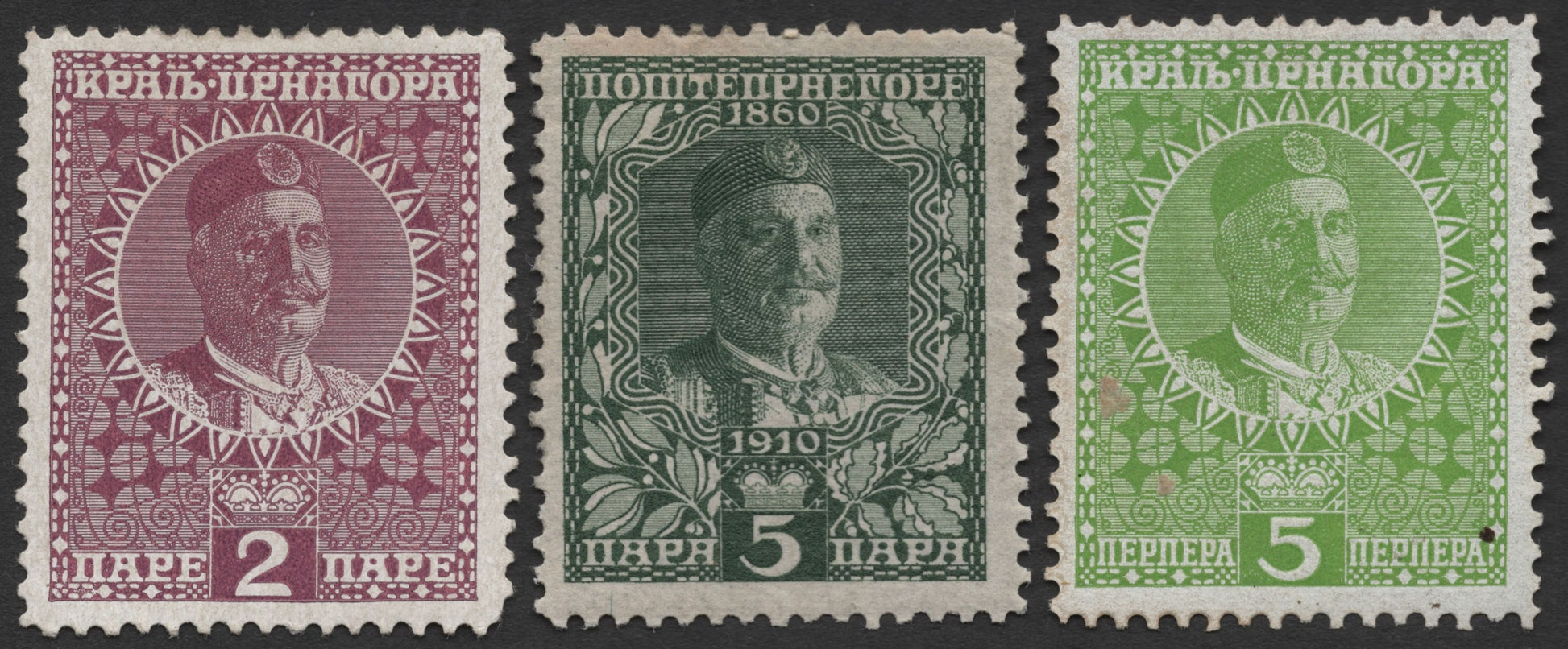 These classic definitive stamps of end="170"Montenegro honor the nation’s only monarch to hold the title of king (proclaimed in 1910). The designs span from 2 para to 5 perpera, each featuring a detailed portrait of Nicholas I in Montenegrin attire, framed by ornate patterns and regal symbolism including crowns and oak leaves. The central stamp is marked "1910" and "1860," commemorating 50 years of his reign. This trio reflects the transition period just before Montenegro’s integration into the Kingdom of Serbs, Croats, and Slovenes (later Yugoslavia).