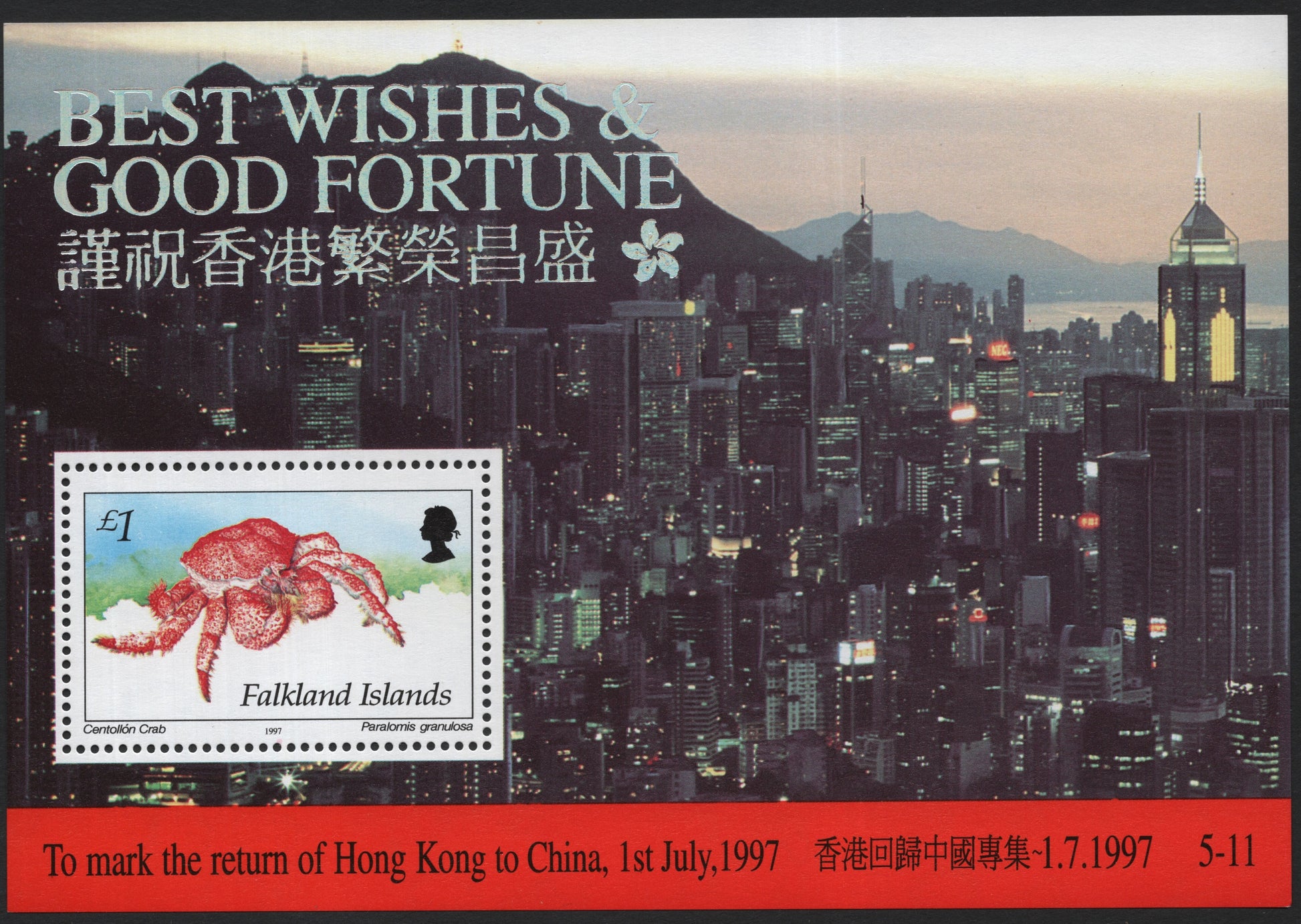 Issued by the Falkland Islands in 1997, this £1 souvenir sheet commemorates the historic return of Hong Kong to China on 1 July 1997. The design features the Centollón Crab (Paralomis granulosa) alongside the skyline of Hong Kong under the message “Best Wishes & Good Fortune.” The issue expresses goodwill from one British territory to another during the transfer of sovereignty, blending natural history with a major geopolitical milestone. The sheet’s bilingual inscriptions and elegant presentation make it a distinctive item in both British colonial and commemorative philately.